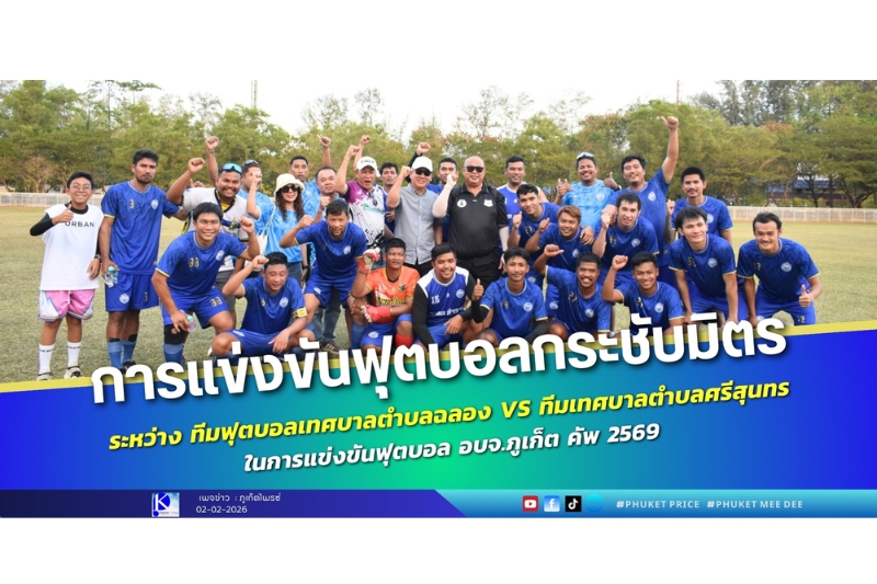 Hotspot ข่าวกีฬา ข่าวทั่วไป การแข่งขันฟุตบอลกระชับมิตร Facebook iconFacebookTwitter iconTwitterLINE iconLine การแข่งขันฟุตบอลกระชับมิตร ระหว่าง ทีมฟุตบอลเทศบาลตำบลฉลอง ทีมเทศบาลตำบลศรีสุนทรในการแข่งขันฟุตบอล อบจ.ภูเก็ต คัพ 2569 วันที่ 1 กุมภาพันธ์ 2569 นายสำราญ จินดาพล นายกเทศมนตรีตำบลฉลอง พร้อมสมาชิกสภาเทศบาล และหัวหน้าส่วนราชการ ร่วมให้กำลังใจนักกีฬาในการแข่งขันฟุตบอลกระชับมิตร เพื่อเสริมสร้างความสัมพันธ์อันดีระหว่างองค์กรปกครองส่วนท้องถิ่น ผลการแข่งขันในเวลาปกติ เสมอกัน และทีมเทศบาลตำบลฉลอง ชนะการยิงจุดโทษ ด้วยสกอร์ 5 : 4 การแข็งขันฟุตบอล อบจ.ภูเก็ต คัพ 2569 จัดขึ้นระหว่างวันที่ 24 มกราคม – 14 กุมภาพันธ์ 2569 เพื่อส่งเสริมให้เด็กเยาวชนมีสุขภาพแข็งแรง บรรยากาศเต็มไปด้วยความสนุกสนาน ความสามัคคี และมิตรภาพที่ดีระหว่างสองทีม Facebook iconFacebookTwitter iconTwitterLINE iconLine 2 ก.พ. 2026 18:48 2 views