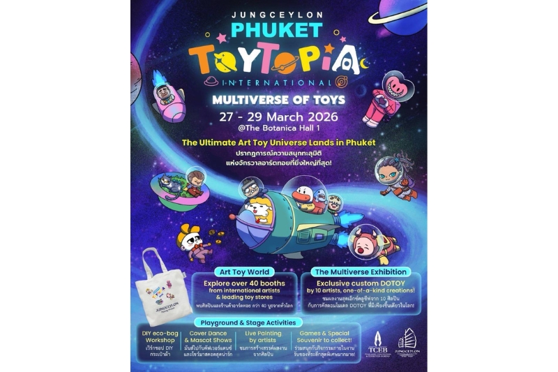 ศูนย์การค้าจังซีลอน ป่าตอง ภูเก็ต สร้างปรากฏการณ์ความสนุกทะลุมิติแห่งจักรวาลอาร์ตทอยครั้งยิ่งใหญ่ขึ้น ภายใต้การจัดงาน “JUNGCEYLON PHUKET TOYTOPIA INTERNATIONAL ตอน MULTIVERSE OF TOYS มหกรรมของเล่นอาร์ตทอยนานาชาติ ครั้งที่ 2 ที่ได้รวบรวมศิลปินและร้านค้าอาร์ตทอยชั้นนำกว่า 40 บูธ จาก 15 ประเทศทั่วโลก ได้แก่ ประเทศไทย, ญี่ปุ่น, จีน, เกาหลีใต้, มาเลเซีย, ฟิลิปปินส์, อินโดนีเซีย, ลาว, เนเธอร์แลนด์ และอังกฤษ เป็นต้น ภายในงานพบกับ The Multiverse Custom Exhibition ร่วมชมผลงานศิลปะสุดเอ็กซ์คลูซีฟจาก 11 ศิลปิน ได้แก่ Nihonbashi19, Jelly, TRA, ZHILA Studio, Cheesyduck_unstop, Ka.roke, Pymdeed, NONWORLD, PYT Room, Boss_sansern และ Sea Chakkraphat และการสร้างสรรค์โมเดล DOTOY ในรูปแบบคัสตอมดีไซน์ที่มีเพียงชิ้นเดียวในโลก นอกจากนั้น ยังมีกิจกรรมเวิร์กชอป D.I.Y. กระเป๋าผ้ารักษ์โลก, สนุกสุดมันส์กับ Cover Dance, ตื่นตาตื่นใจไปกับการแสดงสุดน่ารักจากเหล่า Mascot อาร์ตทอยชื่อดัง, ชมการสร้างสรรค์ผลงานแบบ Live Painting และร่วมสนุกลุ้นรับของที่ระลึกสุดพิเศษอีกมากมาย โดยงานจะจัดขึ้นตั้งแต่วันที่ 27 – 29 มีนาคม 2569 ณ ชั้นG โซนเดอะโบทานิก้า ฮอลล์1 ศูนย์การค้าจังซีลอน ป่าตอง ภูเก็ต