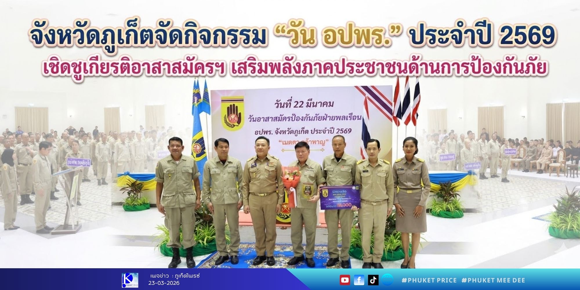 วันนี้ (23 มีนาคม 2569) จังหวัดภูเก็ตจัดกิจกรรมเนื่องใน “วันอาสาสมัครป้องกันภัยฝ่ายพลเรือน (อปพร.)” ประจำปี 2569 ณ หอประชุมมหิศรภักดี ศาลากลางจังหวัดภูเก็ต โดยมีนายนิรัตน์ พงษ์สิทธิถาวร ผู้ว่าราชการจังหวัดภูเก็ต ในฐานะผู้อำนวยการศูนย์ อปพร.จังหวัดภูเก็ต เป็นประธานในพิธี พร้อมด้วย พล.ร.ต. ประพันธ์ ศรีสุวิภา รองผู้อำนวยการรักษาความมั่นคงภายในจังหวัดภูเก็ต (ท) พ.ต.อ.ภาสกร สนธิกุล รอง ผบก.ภ.จว.ภูเก็ต นายจรัญ ขวัญแก้ว รักษาราชการแทนหัวหน้าสำนักงานป้องกันและบรรเทาสาธารณภัยจังหวัดภูเก็ต หัวหน้าส่วนราชการ ผู้บริหารหน่วยงาน สมาชิก อปพร. และภาคีเครือข่ายเข้าร่วมอย่างพร้อมเพรียง