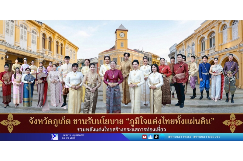 วันที่ 2 เมษายน 2569 จังหวัดภูเก็ต โดยสำนักงานวัฒนธรรมจังหวัดภูเก็ต ผนึกกำลังภาครัฐ ภาคเอกชน และประชาชน ร่วมขานรับนโยบาย “ภูมิใจแต่งไทยทั้งแผ่นดิน ของกระทรวงวัฒนธรรม ร่วมกันแต่งกายชุดไทยและชุดไทยประยุกต์ ถ่ายภาพตามจุดเช็คอินสำคัญ โดยเฉพาะแยกธนาคารชาร์เตอร์ย่านเมืองเก่า และลานมังกร เพื่อประกาศพลังความร่วมมือในการสืบสานวัฒนธรรมไทย