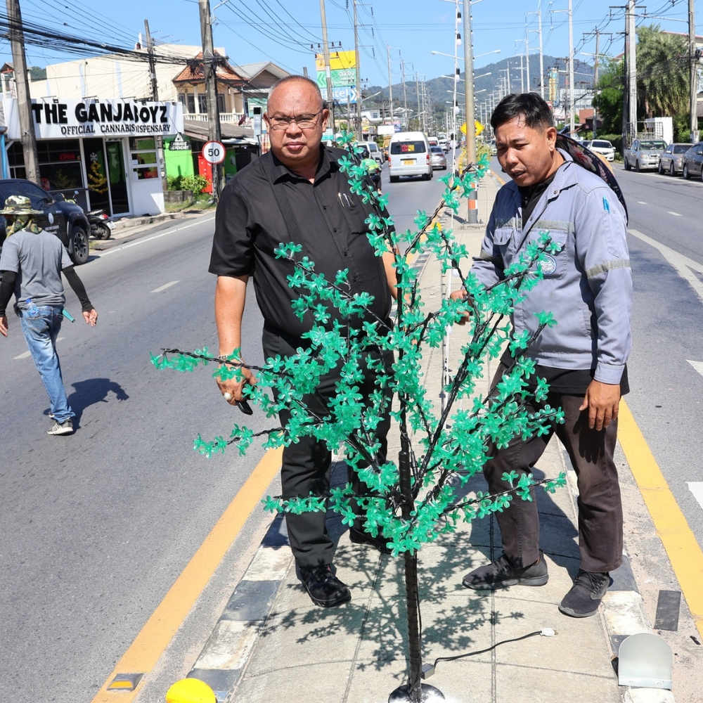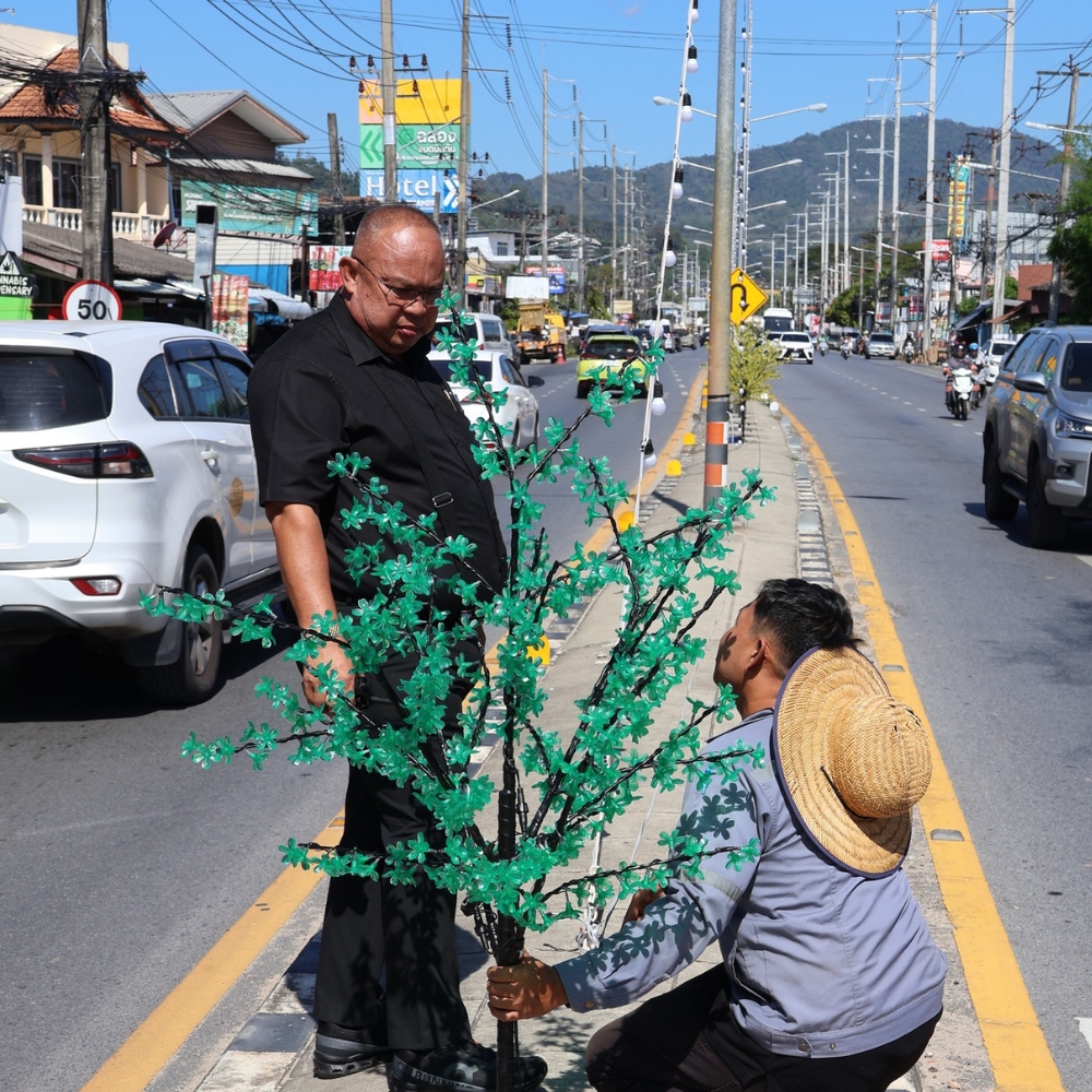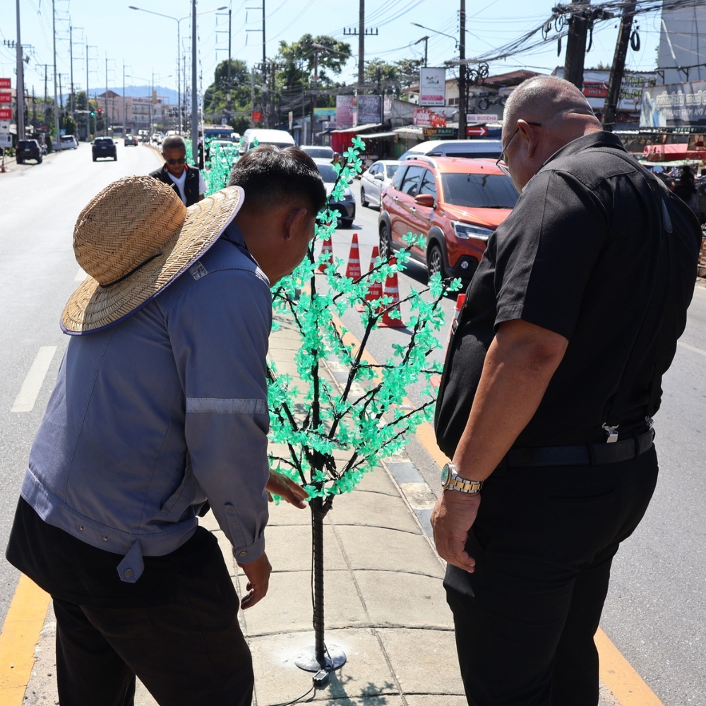 นายสำราญ จินดาพล นายกเทศมนตรีตำบลฉลอง ลงพื้นที่ตรวจสอบการตกแต่งเมืองและการประดับไฟ เพื่อเพิ่มทัศนียภาพให้สวยงาม สร้างบรรยากาศแห่งความสุข ให้สอดคล้องกับช่วงเทศกาล คริสต์มาสและปีใหม่