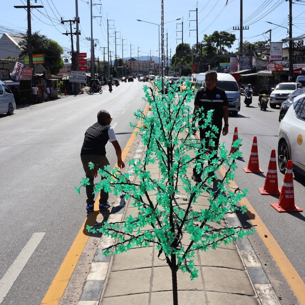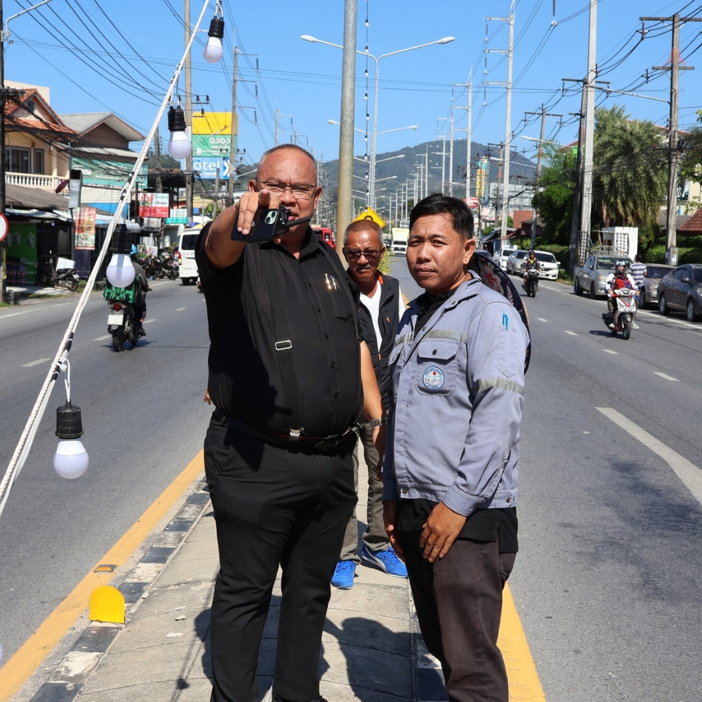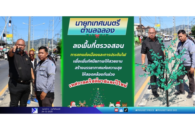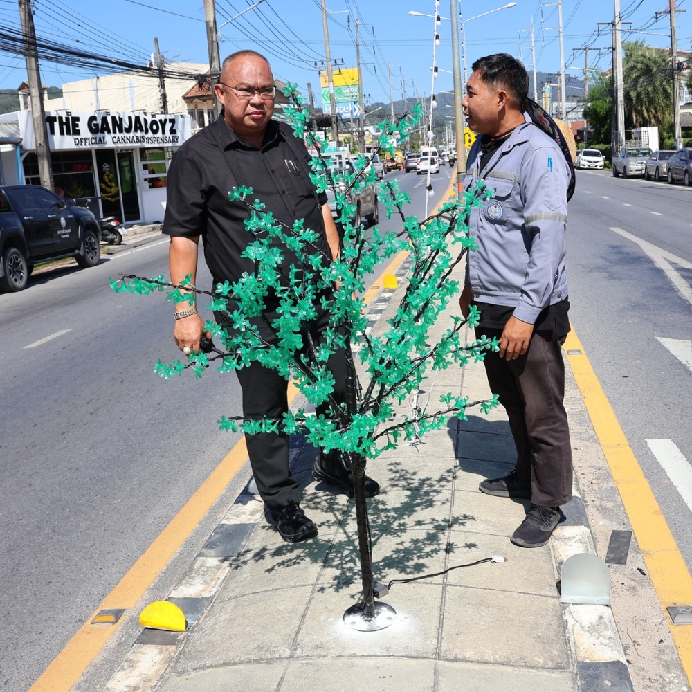 นายสำราญ จินดาพล นายกเทศมนตรีตำบลฉลอง ลงพื้นที่ตรวจสอบการตกแต่งเมืองและการประดับไฟ เพื่อเพิ่มทัศนียภาพให้สวยงาม สร้างบรรยากาศแห่งความสุข ให้สอดคล้องกับช่วงเทศกาล คริสต์มาสและปีใหม่