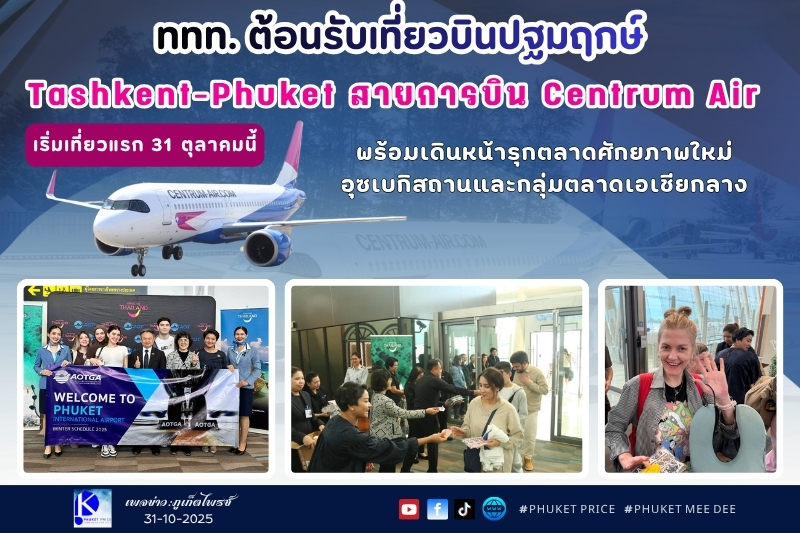 การท่องเที่ยวแห่งประเทศไทย (ททท.) ต้อนรับเที่ยวบินปฐมฤกษ์ C6529 ของสายการบิน Centrum Air จากสาธารณรัฐอุซเบกิสถาน เส้นทาง Tashkent–Phuket ในวันที่ 31 ตุลาคม 2568 ด้วยความจุผู้โดยสาร 186 ที่นั่ง และมี Load Factor ร้อยละ 95 เดินทางถึงท่าอากาศยานภูเก็ต เวลา 14.10 น. โอกาสนี้ ได้รับเกียรติจากนายสันติ แสวงเจริญ ผู้อำนวยการภูมิภาคอเมริกา ตะวันออกกลาง และแอฟริกา ททท. นางสาวกาญจนา สิงห์อุดม ผู้อำนวยการ ททท.สำนักงานมอสโก และ นางสาวศิริวรรณ สีหาราช ผู้อำนวยการ ททท.สำนักงานภูเก็ต และผู้แทนจากท่าอากาศยานนานาชาติภูเก็ตร่วมให้การต้อนรับนักท่องเที่ยวอย่างอบอุ่น ณ ท่าอากาศยานภูเก็ต โดยเที่ยวบินดังกล่าวมี Influencers ชั้นนำร่วมเดินทางสำรวจแหล่งท่องเที่ยวในจังหวัดภูเก็ตและพื้นที่ใกล้เคียงตลอด 7 วัน ระหว่างวันที่ 31 ตุลาคม–7 พฤศจิกายน 2568 เพื่อนำเสนอประสบการณ์ท่องเที่ยวแบบฟูลแพ็กเกจ ครบทั้งธรรมชาติ ศิลปวัฒนธรรม และวิถีชีวิตไทย สร้างแรงบันดาลใจให้นักท่องเที่ยวอุซเบกิสถานและกลุ่มตลาดเอเชียกลางเดินทางมาสัมผัสประสบการณ์ในประเทศไทย