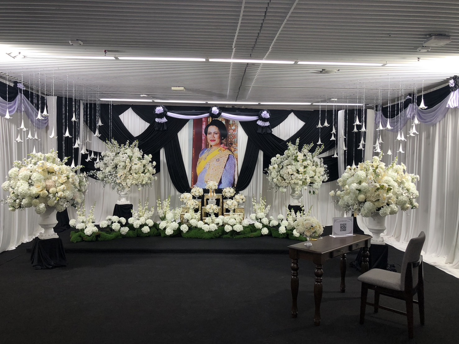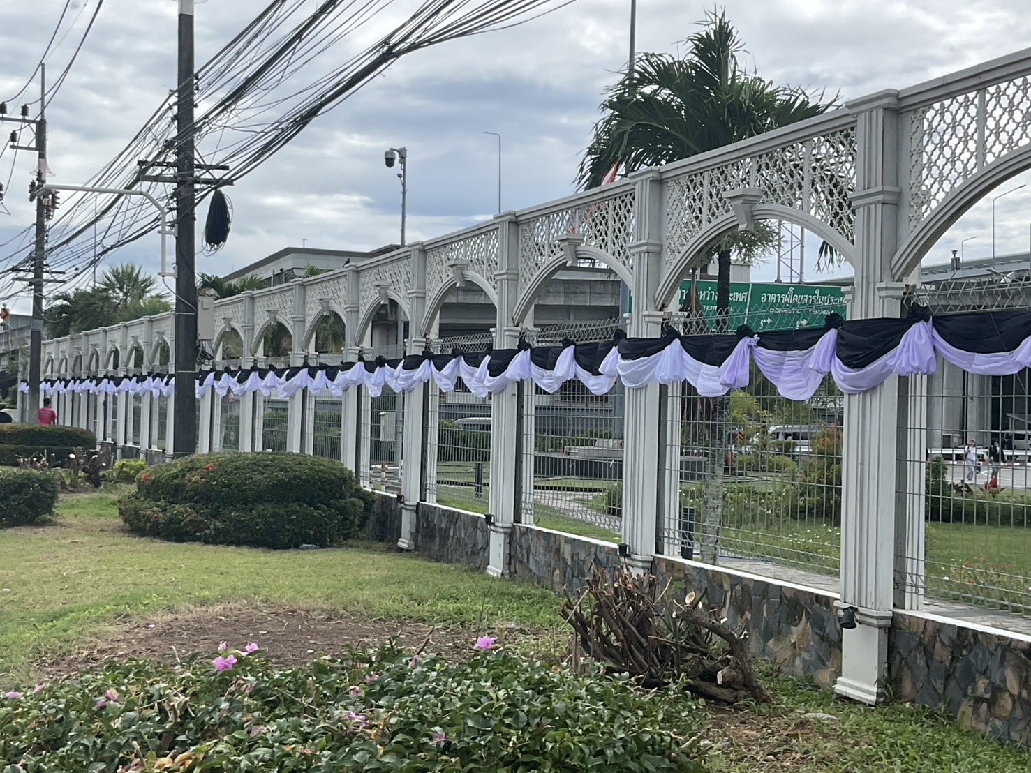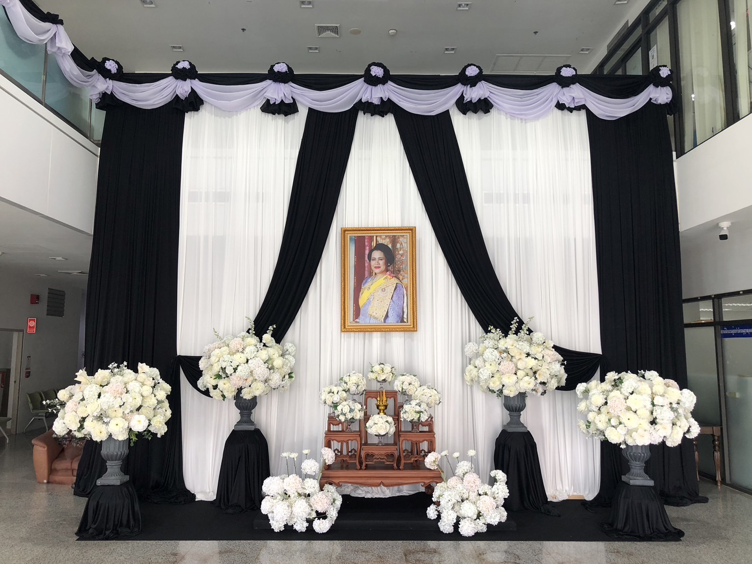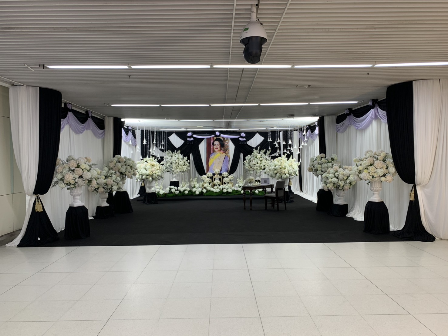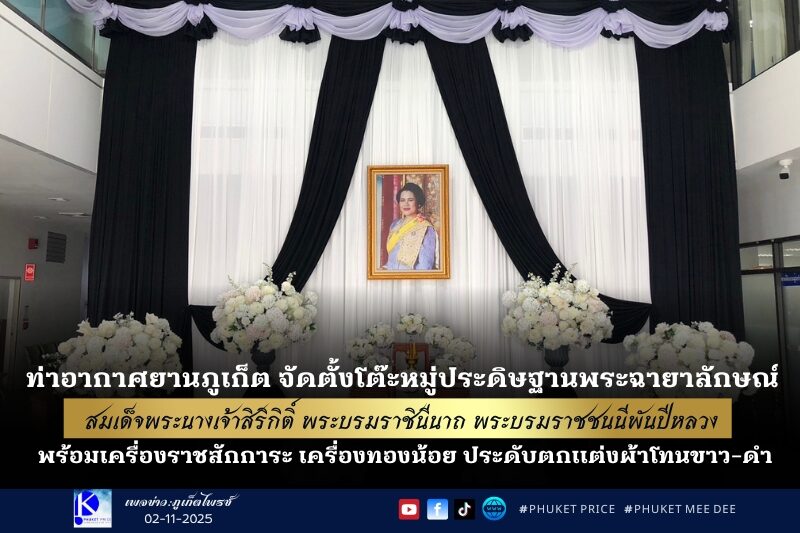 ท่าอากาศยานภูเก็ต จัดตั้งโต๊ะหมู่ประดิษฐานพระฉายาลักษณ์ สมเด็จพระนางเจ้าสิริกิติ์ พระบรมราชินีนาถ พระบรมราชชนนีพันปีหลวง พร้อมเครื่องราชสักการะ เครื่องทองน้อย ประดับตกแต่งผ้าโทนขาว–ดำ