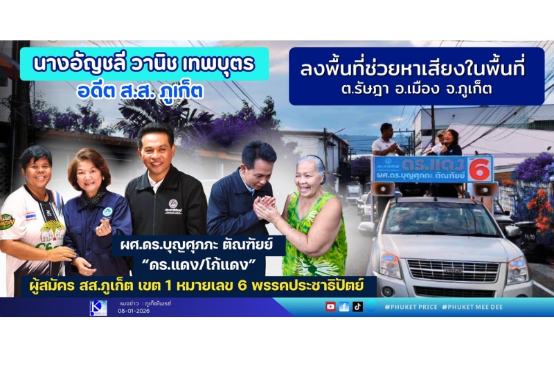 นางอัญชลี วานิช เทพบุตร อดีตส.ส. ภูเก็ตลงพื้นที่ช่วยผศ.ดร.บุญศุภภะ ตัณฑัยย์ หรือ “ดร.แดง/โก้แดง” ผู้สมัครสมาชิกสภาผู้แทนราษฎร จังหวัดภูเก็ต เขต 1 หมายเลข 6 พรรคประชาธิปัตย์ หาเสียงในพื้นที่ ต.รัษฎา อ.เมือง จ.ภูเก็ต