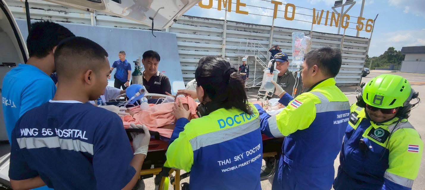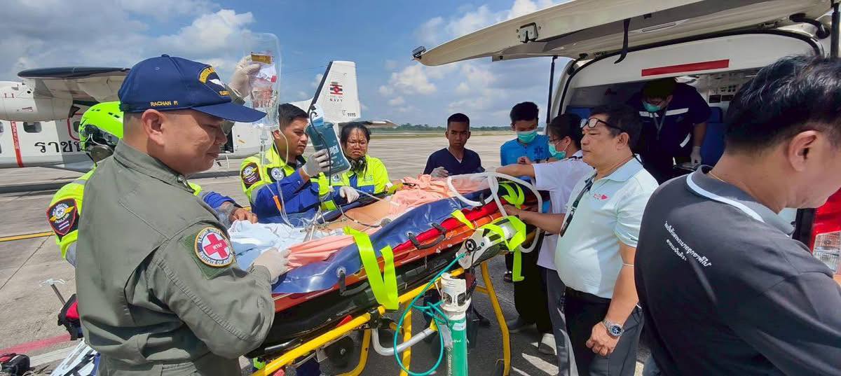 สำหรับผู้ป่วยรายดังกล่าว เป็นเคสที่ ศูนย์นเรนทรไข่มุก 1669 องค์การบริหารส่วนจังหวัดภูเก็ต ได้ประสาน กองทัพเรือภาคที่ 3 เพื่อขอใช้อากาศยาน (เครื่องบิน Dornier) ลำเลียงผู้ป่วยทางอากาศไปรักษาต่อยัง โรงพยาบาลสงขลานครินทร์ (ม.อ.หาดใหญ่)