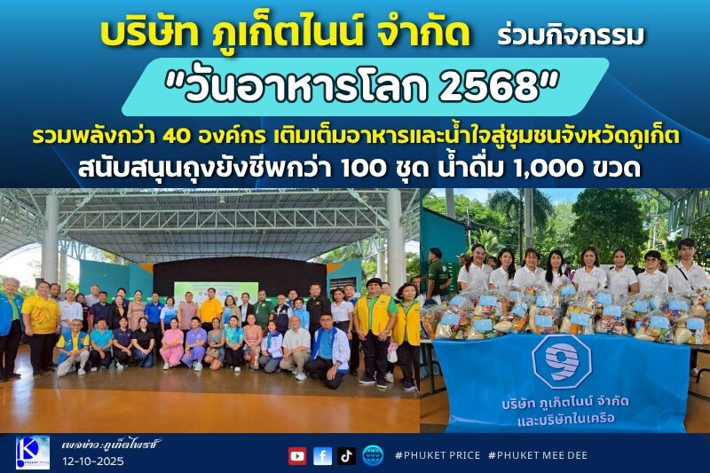 บริษัท ภูเก็ตไนน์ จำกัด ร่วมกิจกรรม “วันอาหารโลก 2568” รวมพลังกว่า 40 องค์กร เติมเต็มอาหารและน้ำใจสู่ชุมชนจังหวัดภูเก็ต สนับสนุนถุงยังชีพกว่า 100 ชุด น้ำดื่ม 1,000 ขวด