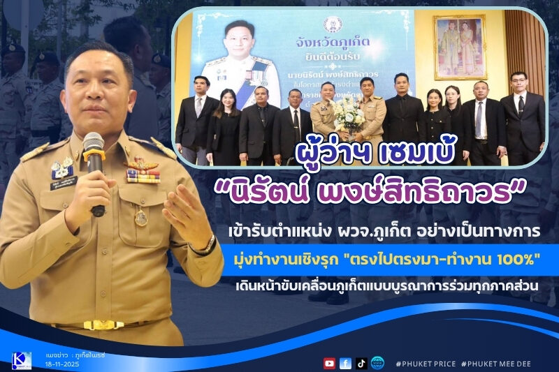ผู้ว่าฯ เซมเบ้ “นิรัตน์ พงษ์สิทธิถาวร” เข้ารับตำแหน่งผู้ว่าราชการจังหวัดภูเก็ตอย่างเป็นทางการ มุ่งทำงานเชิงรุก “ตรงไปตรงมา–ทำงาน 100%” เดินหน้าขับเคลื่อนภูเก็ตแบบบูรณาการร่วมทุกภาคส่วน