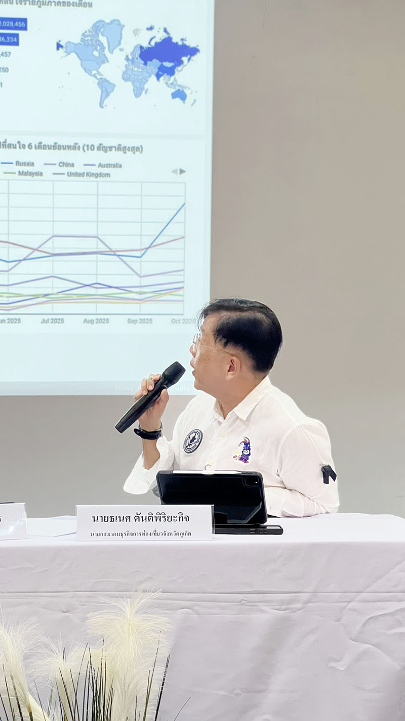 ขณะที่ นายธเนศ ตันติพิริยะกิจ นายกสมาคมธุรกิจการท่องเที่ยวจังหวัดภูเก็ต เปิดเผยถึงทิศทางเศรษฐกิจท่องเที่ยวว่า ในช่วง 9 เดือนแรกของปี 2568 (มกราคม–กันยายน) จังหวัดภูเก็ตมีรายได้รวมจากการท่องเที่ยวกว่า 398,900 ล้านบาท คาดว่าครบปีจะทะลุ 500,000 ล้านบาท โดยตลาดยุโรป โดยเฉพาะเยอรมนี มีอัตราการเติบโตสูงอย่างต่อเนื่อง