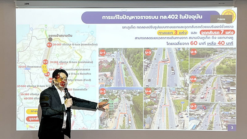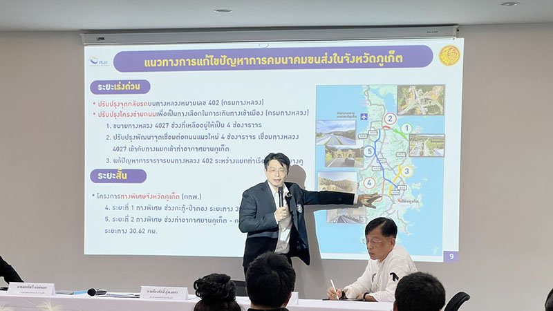 นายก้องศักดิ์ คู่พงศกร กล่าวว่า ภาคเอกชนภูเก็ตได้ร่วมกันติดตามปัญหาและแนวทางพัฒนาระบบคมนาคมของจังหวัดอย่างต่อเนื่อง โดยเฉพาะถนนสายหลักหมายเลข 402 ซึ่งเป็นเส้นทางหลักเข้าสู่จังหวัด ปัจจุบันแขวงทางหลวงภูเก็ตได้ทดลองปรับรูปแบบทางแยกและจุดกลับรถแบบชั่วคราว รวม 10 จุด ทำให้สามารถลดระยะเวลาเดินทางจากท่าอากาศยานภูเก็ตถึงแยกบางคู จากเดิมเฉลี่ย 60 นาที เหลือเพียง 40 นาที