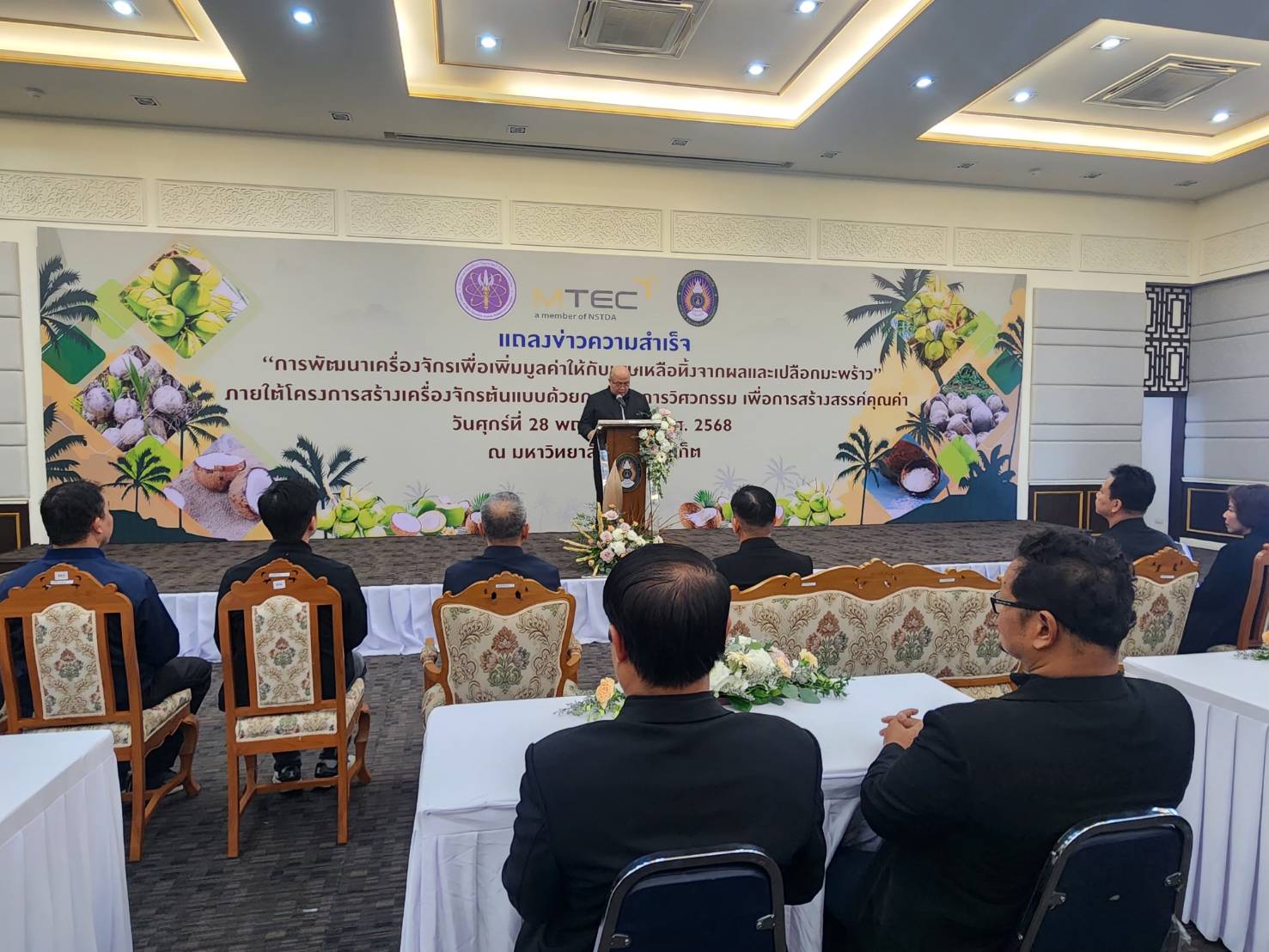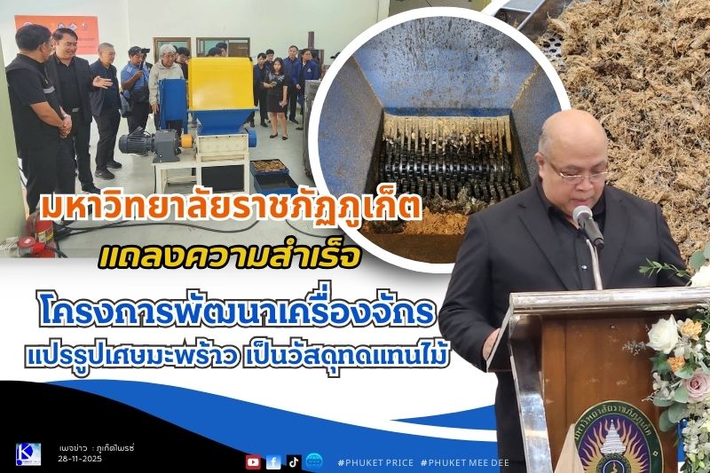 วันที่ 28 พฤศจิกายน 2568 ที่ห้องประชุมแคแสด ชั้น 4 อาคารเฉลิมพระเกียรติ มหาวิทยาลัยราชภัฏภูเก็ต มหาวิทยาลัยราชภัฏภูเก็ต ร่วมกับศูนย์เทคโนโลยีโลหะและวัสดุแห่งชาติ (MTEC) สำนักงานพัฒนาวิทยาศาสตร์และเทคโนโลยีแห่งชาติ (สวทช.) ได้แถลงความสำเร็จโครงการสร้างเครื่องจักรต้นแบบ สำหรับแปรรูปเศษเหลือทิ้งจากมะพร้าวน้ำหอมเป็นวัสดุทดแทนไม้ ซึ่งนำเสนอแนวทางการแก้ไขปัญหาการเกิน waste ของจังหวัดภูเก็ต โดยเฉพาะสูงถึง 3,000 ลูกต่อวัน