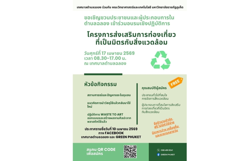 Hotspot ข่าวทั่วไป ข่าวประชาสัมพันธ์ เทศบาลตำบลฉลอง ร่วมกับ คณะวิทยาศาสตร์และเทคโนโลยี มหาวิทยาลัยราชภัฎภูเก็ต Facebook iconFacebookTwitter iconTwitterLINE iconLine เทศบาลตำบลฉลอง ร่วมกับ คณะวิทยาศาสตร์และเทคโนโลยี มหาวิทยาลัยราชภัฎภูเก็ต ขอเชิญชวนประชาชนและผู้ประกอบการในตำบลฉลอง เข้าร่วมอบรมเชิงปฏิบัติการ โครงการส่งเสริมการท่องเที่ยวที่เป็นมิตรกับสิ่งแวดล้อม วันที่: 17 เมษายน 2569 สถานที่: เทศบาลตำบลฉลอง หัวข้อกิจกรรม สถานการณ์และปัญหาขยะในชุมชน แนวคิดการนำวัสดุใช้แล้วกลับมาใช้ใหม่ ปฏิบัติการ Waste to Art ออกแบบและสร้างผลงานศิลปะจากพลาสติกใช้แล้ว รับจำนวนจำกัด ฟรี ไม่มีค่าใช้จ่าย สมัครเข้าร่วมกิจกรรม : https://forms.gle/MEeEnjar3tqxUxCn8 Facebook iconFacebookTwitter iconTwitterLINE iconLine 4 เม.ย. 2026 19:28 5 views