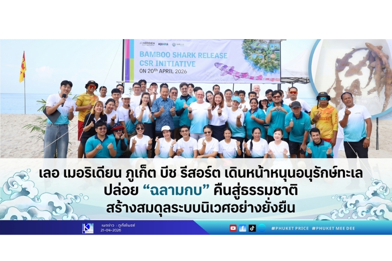 ภูเก็ต – วันที่ 20 เมษายน 2569 – เลอ เมอริเดียน ภูเก็ต บีช รีสอร์ต เดินหน้าตอกย้ำพันธกิจด้านความยั่งยืนและการอนุรักษ์ทรัพยากรทางทะเล จัดกิจกรรมปล่อย “ฉลามกบ” (Bamboo Shark) คืนสู่ธรรมชาติ โดยความร่วมมือกับ Aquaria Phuket เพื่อร่วมฟื้นฟูระบบนิเวศทางทะเลของจังหวัดภูเก็ต โดยมีนายจูเลี่ยน ลาวรี่ ผู้จัดการทั่วไป เลอ เมอริเดียน ภูเก็ต บีช รีสอร์ต นาย Daryl Foong ประธานเจ้าหน้าที่บริหาร Aquawalk Group นายวิมล หนูแก้ว ประชาสัมพันธ์จังหวัดภูเก็ต นางสาวจุฑามาส ประจักษ์ศิลป์ รองผู้อำนวยการ การท่องเที่ยวแห่งประเทศไทย สำนักงานภูเก็ต พร้อมด้วยแขกผู้เข้าพัก นักท่องเที่ยวชาวต่างชาติร่วมกิจกรรม