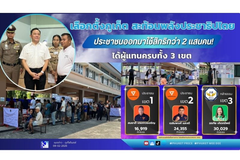 Hotspot Inside News ท้องถิ่น - การเมือง เลือกตั้งภูเก็ตสะท้อนพลังประชาธิปไตย ประชาชนออกมาใช้สิทธิกว่า 2 แสนคน ได้ผู้แทนครบทั้ง 3 เขต Facebook iconFacebookTwitter iconTwitterLINE iconLine Facebook iconFacebookTwitter iconTwitterLINE iconLine 9 ก.พ. 2026 19:38 9 views