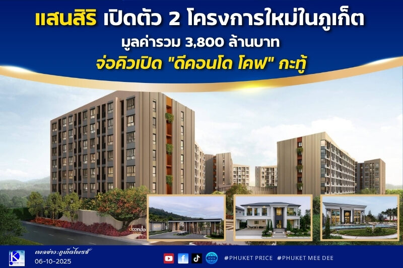 แสนสิริ เปิดตัว 2 โครงการใหม่ในภูเก็ต มูลค่ารวม 3,800 ล้านบาท จ่อคิวเปิด “ดีคอนโด โคฟ” ทำเล กะทู้ ต่อยอดความสำเร็จ ดีคอนโด รีฟ Sold out! ปลื้มคนภูเก็ตเชื่อมั่น เศรษฐสิริ เกาะแก้ว รีทรีต ยอดขายรอบ VVIP พุ่ง 700 ล้านบาท
