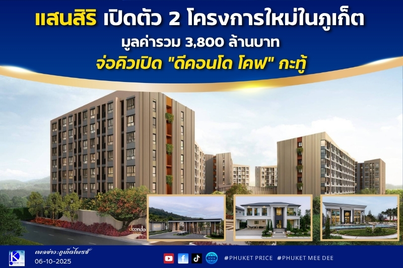 o แสนสิริจ่อคิวเปิดตัว 2 โครงการใหม่ในภูเก็ตรับไฮซีซันของเกาะภูเก็ต ทั้งคอนโดมิเนียมใหม่ ตอกย้ำความสำเร็จแบรนด์ “ดีคอนโด” และ บ้านเดี่ยวระดับลักซ์ชัวรี แบรนด์ “เศรษฐสิริ” เปิดตัวครั้งแรกในภูเก็ต