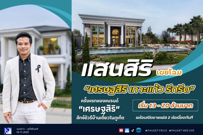 แสนสิริ เผยโฉม “เศรษฐสิริ เกาะแก้ว รีทรีต” ครั้งแรกของแบรนด์ “เศรษฐสิริ” ลักซ์ชัวรีบ้านเดี่ยวในภูเก็ต เริ่ม 13 – 20 ล้านบาท พร้อมเปิดขายเฟส 2 ต่อเนื่องทันที