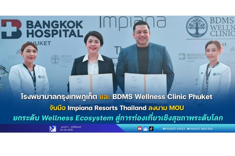 ภูเก็ต, 26 มีนาคม 2569 – โรงพยาบาลกรุงเทพภูเก็ต และ BDMS Wellness Clinic Phuket ร่วมลงนามบันทึกข้อตกลงความร่วมมือ (MOU) กับ Impiana Resorts Thailand อย่างเป็นทางการ เพื่อพัฒนาและยกระดับ Wellness Ecosystem หรือระบบนิเวศด้านสุขภาพแบบองค์รวม มุ่งสู่การเป็นต้นแบบของการท่องเที่ยวเชิงสุขภาพในประเทศไทยและระดับสากล ภายในงานได้รับเกียรติจากผู้บริหารระดับสูงของทั้งสององค์กร พร้อมด้วยพันธมิตรทางธุรกิจและสื่อมวลชนเข้าร่วมเป็นสักขีพยาน ณ Impiana Private Villas Kata Noi