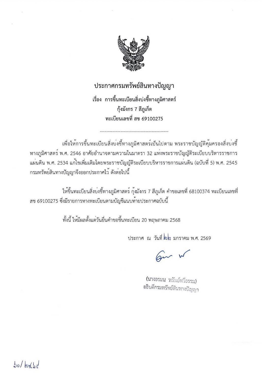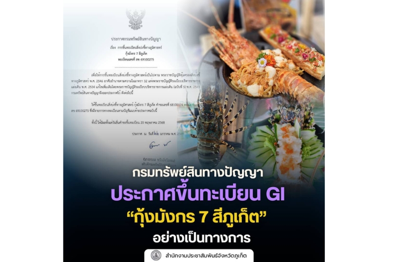 ✨️เมื่อวันที่ 22 มกราคม พ.ศ. 2569 นางอรมน ทรัพย์ทวีธรรม อธิบดีกรมทรัพย์สินทางปัญญา กรมทรัพย์สินทางปัญญา ประกาศขึ้นทะเบียนสิ่งบ่งชี้ทางภูมิศาสตร์ (GI) สินค้า “กุ้งมังกร 7 สีภูเก็ต” อย่างเป็นทางการ ถือเป็นอีกหนึ่งความภาคภูมิใจของจังหวัดภูเก็ต และเป็นก้าวสำคัญในการยกระดับสินค้าอาหารทะเลท้องถิ่นสู่มาตรฐานระดับประเทศ ซึ่งการขึ้นทะเบียน GI ครั้งนี้ เป็นการรับรองว่า กุ้งมังกร 7 สีภูเก็ต เป็นสินค้าที่มีเอกลักษณ์เฉพาะถิ่น ทั้งด้านแหล่งกำเนิด คุณภาพ และชื่อเสียง ซึ่งไม่สามารถลอกเลียนแบบได้จากพื้นที่อื่น ช่วยสร้างความเชื่อมั่นให้กับผู้บริโภค และเพิ่มมูลค่าให้กับผลผลิตของชาวประมงในพื้นที่จังหวัดภูเก็ต