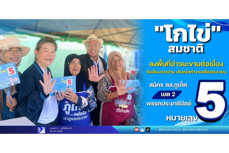นายสมชาติ สมนาม โกไข่ ผู้สมัคร สส.ภูเก็ต เขต 2 หมายเลข 5 พรรคประชาธิปัตย์ ลงพื้นที่หาเสียงบริเวณอ่าวมะขาม แหลมพันวา และมัสยิดอ่าวมะขาม โดยมีคุณอัญชลี วานิช เทพบุตร อดีต สส.ภูเก็ต ร่วมลงพื้นที่ พบปะพูดคุย รับฟังปัญหาอย่างใกล้ชิด ท่ามกลางการตอบรับที่อบอุ่นจากชาวบ้าน พร้อมย้ำความมุ่งมั่นเดินหน้าทำงานเพื่อประชาชนอย่างจริงจัง