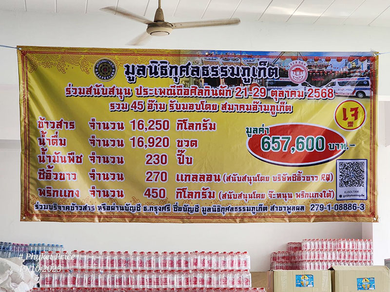āđƒāļ™āđ‚āļ­āļāļēāļŠāļ™āļĩāđ‰ āļĄāļđāļĨāļ™āļīāļ˜āļīāļāļļāļĻāļĨāļ˜āļĢāļĢāļĄāļ āļđāđ€āļāđ‡āļ•āđ„āļ”āđ‰āļĄāļ­āļš āļ‚āđ‰āļēāļ§āļŠāļēāļĢ āļ™āđ‰āļģāļ”āļ·āđˆāļĄ āđ€āļ„āļĢāļ·āđˆāļ­āļ‡āļ›āļĢāļļāļ‡āļ­āļēāļŦāļēāļĢ āđāļĨāļ°āļšāļ°āļŦāļĄāļĩāđˆāļāļķāđˆāļ‡āļŠāļģāđ€āļĢāđ‡āļˆāļĢāļđāļ›āđ„āļ§āđ„āļ§ āļĻāļēāļĨāđ€āļˆāđ‰āļēāļĨāļ° 2 āļĨāļąāļ‡ āđƒāļŦāđ‰āđāļāđˆāļĻāļēāļĨāđ€āļˆāđ‰āļēāļ•āđˆāļēāļ‡ āđ† āļĢāļ§āļĄ 46 āļ­āđŠāļēāļĄāļ—āļąāđˆāļ§āļˆāļąāļ‡āļŦāļ§āļąāļ”āļ āļđāđ€āļāđ‡āļ•āđāļĨāļ°āļžāļ·āđ‰āļ™āļ—āļĩāđˆāđƒāļāļĨāđ‰āđ€āļ„āļĩāļĒāļ‡ āđ€āļžāļ·āđˆāļ­āđƒāļŠāđ‰āđƒāļ™āļāļēāļĢāļ›āļĢāļ°āļāļ­āļšāļžāļīāļ˜āļĩāđāļĨāļ°āļšāļĢāļīāļāļēāļĢāļ›āļĢāļ°āļŠāļēāļŠāļ™āļ•āļĨāļ­āļ”āļŠāđˆāļ§āļ‡āļ‡āļēāļ™āļ–āļ·āļ­āļĻāļĩāļĨāļāļīāļ™āļœāļąāļ āļĢāļ°āļŦāļ§āđˆāļēāļ‡āļ§āļąāļ™āļ—āļĩāđˆ 21–29 āļ•āļļāļĨāļēāļ„āļĄ 2568 āļĢāļ§āļĄāļĄāļđāļĨāļ„āđˆāļēāļāļ§āđˆāļē 657,600 āļšāļēāļ— āđ‚āļ”āļĒāđ„āļ”āđ‰āļĢāļąāļšāļāļēāļĢāļŠāļ™āļąāļšāļŠāļ™āļļāļ™āļˆāļēāļāļ āļēāļ„āļ˜āļļāļĢāļāļīāļˆāļ—āđ‰āļ­āļ‡āļ–āļīāđˆāļ™ āļ­āļēāļ—āļī āđ‚āļĢāļ‡āļ‡āļēāļ™āļ‹āļĩāļ­āļīāđŠāļ§āļ•āļ‡āļŪāļąāđ‰āļ§āļ­āļēāļĢāđŒāļ„āļīāļ§ āļŠāļļāļĢāļēāļĐāļŽāļĢāđŒāļ˜āļēāļ™āļĩ, āļˆāđŠāļ°āļŦāļ™āļļāļ™ āļžāļĢāļīāļāđāļāļ‡āđƒāļ•āđ‰, āļšāļĢāļīāļĐāļąāļ— āļ āļđāđ€āļāđ‡āļ•āđ„āļ™āļ™ āļˆāļģāļāļąāļ” āđāļĨāļ°āļšāļĢāļīāļĐāļąāļ— āđ„āļ§āđ„āļ§ āļˆāļģāļāļąāļ”