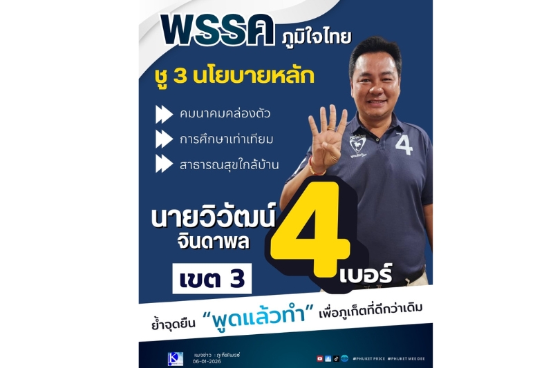 💙 ย้ำอุดมการณ์ “พูดแล้วทำ” นายวิวัฒน์ระบุว่า ทั้งคมนาคม การศึกษา และสาธารณสุข คือหัวใจสำคัญของการพัฒนาคุณภาพชีวิตประชาชน พร้อมขอแรงสนับสนุนจากพ่อแม่พี่น้องชาวภูเก็ต เพื่อร่วมกันผลักดันให้จังหวัดภูเก็ต “ดีกว่าเดิม” ตามสโลแกนของพรรคภูมิใจไทย พร้อมเชิญชวนประชาชน เลือกผู้สมัครหมายเลข 4 เขต 3 และเลือกพรรคภูมิใจไทย หมายเลข 37 ในวันเลือกตั้ง 8 กุมภาพันธ์ 2569