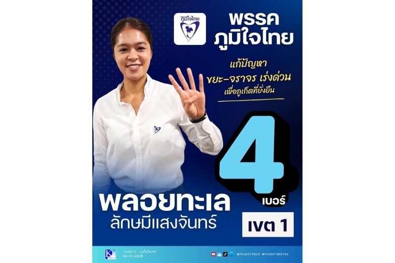 Read more🗳️ “พลอยทะเล เบอร์ 4 ภูมิใจไทย” ชูแก้ปัญหาขยะ–จราจร เร่งด่วน เพื่อภูเก็ตที่ยั่งยืน 👩💼 แนะนำตัวผู้สมัคร : นางสาว พลอยทะเล ลักษมีแ…