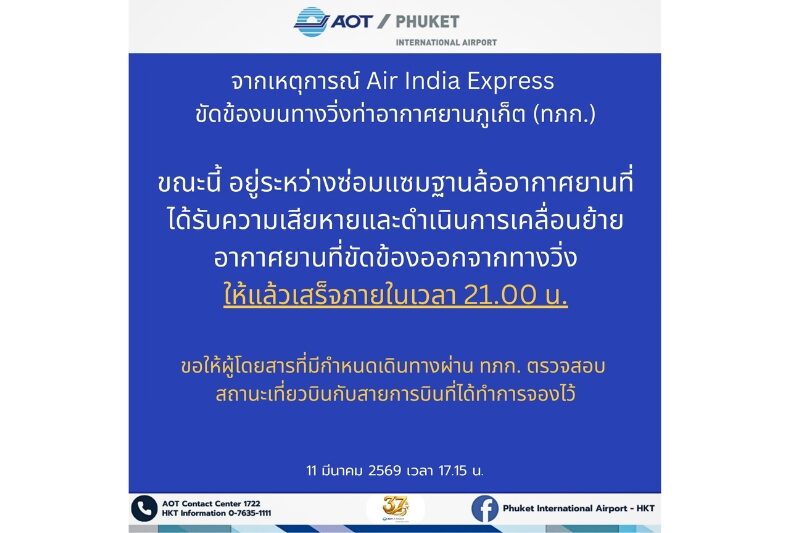 ท่าอากาศยานภูเก็ตชี้แจงกรณีอากาศยานขัดข้องบนทางวิ่ง ยืนยันไม่มีผู้ได้รับบาดเจ็บ และเร่งดำเนินการตามมาตรฐานความปลอดภัย วันที่ 11 มีนาคม 2569 …