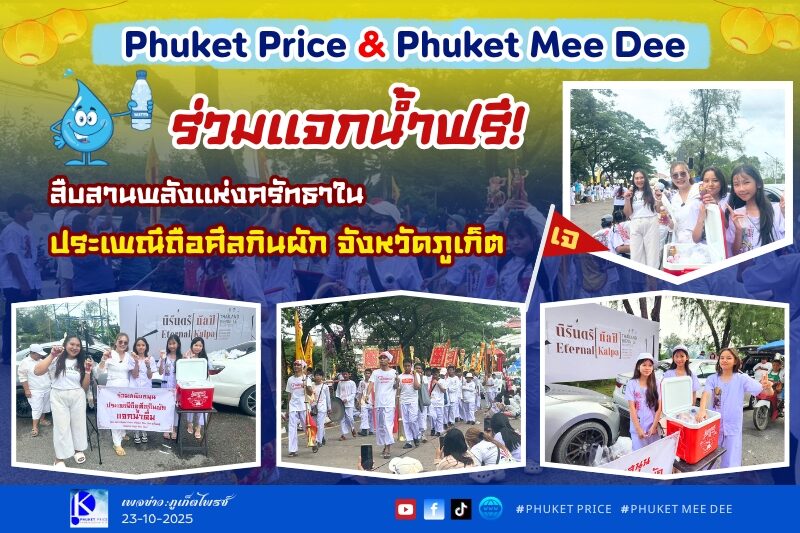 🎉💧 Phuket Price & Phuket Mee Dee ร่วมแจกน้ำฟรี! 💧🎉 สืบสานพลังแห่งศรัทธาใน ประเพณีถือศีลกินผัก จังหวัดภูเก็ต 🙏✨ วันนี้ (23 ตุลาคม 2568) ทีมงานจากเพจ Phuket Price และ Phuket Mee Dee – ภูเก็ตมีดี พร้อมใจร่วมกิจกรรม “แจกน้ำฟรี” 9 วัน ให้กับประชาชนและผู้ร…
