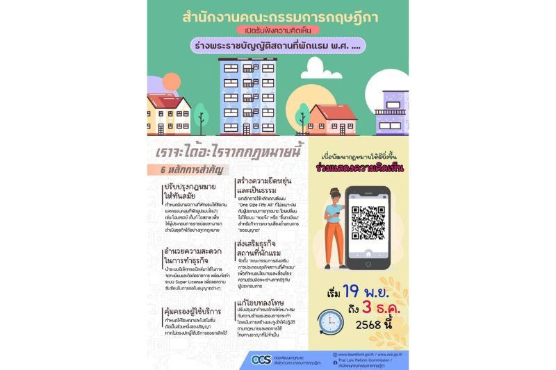 🚩คณะกรรมการพัฒนากฎหมาย สำนักงานคณะกรรมการกฤษฎีกา เปิดรับฟังความคิดเห็นต่อร่างพระราชบัญญัติสถานที่พักแรม พ.ศ. …. (ครั้งที่ 2) ซึ่งมีสาระสำคัญเป็นการปรับปรุงพระราชบัญญัติโรงแรม พ.ศ. 2547 ➡️➡️ทั้งนี้ เพื่อขยายขอบเขตให้ครอบคลุมประเภทและชนิดของสถานที่พ…