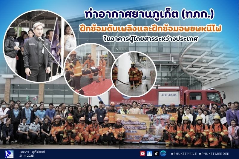 🚩ท่าอากาศยานภูเก็ต (ทภก.) ฝึกซ้อมตามขั้นตอนการปฏิบัติ วันที่ 20 พ.ย.68 เวลา 13.30 น. นายพณพล พงส์นิวัตร ผู้อำนวยการฝ่ายดับเพลิงและกู้ภัย ท่าอากาศยานภูเก็ต (ผอก.ฝดภ.ทภก.) เป็นประธานการฝึกซ้อมดับเพลิงและฝึกซ้อมอพยพหนีไฟในอาคารผู้โดยสารระหว่างประเทศ …