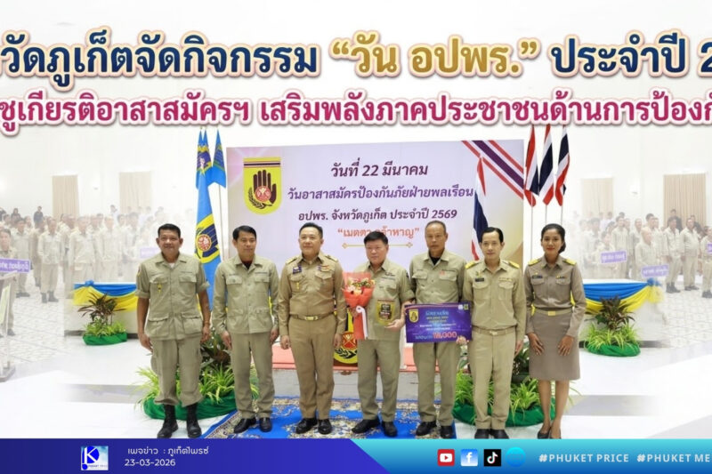 จังหวัดภูเก็ตจัดกิจกรรม “วัน อปพร.” ประจำปี 2569 เชิดชูเกียรติอาสาสมัครฯ เสริมพลังภาคประชาชนด้านการป้องกันภัย . วันนี้ (23 มีนาคม 2569) จังหวัดภูเก็ตจัดกิจกรรมเนื่องใน “วันอาสาสมัครป้องกันภัยฝ่ายพลเรือน (อปพร.)” ประจำปี 2569 ณ หอประชุมมหิศรภักดี ศาลากลางจังหวั…