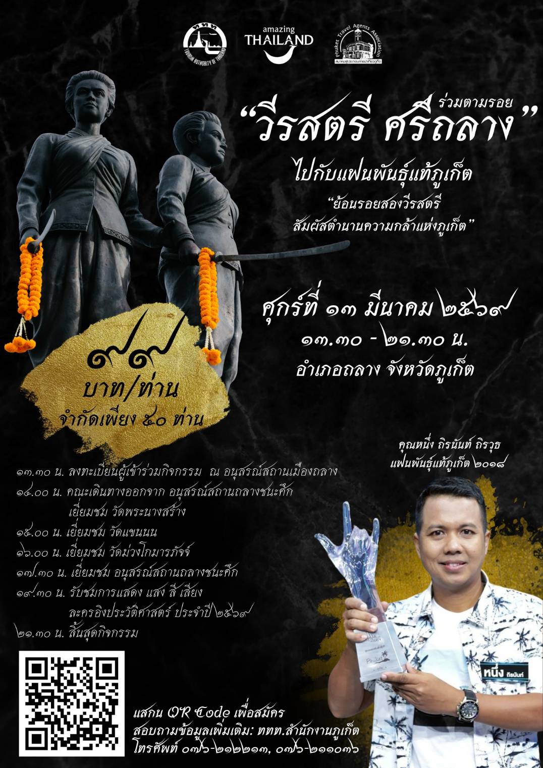 📣 ชวนสายประวัติศาสตร์ & คนรักภูเก็ต มาตามรอย “วีรสตรี ศรีถลาง” ท้าวเทพกระษัตรี ท้าวศรีสุนทร ไปกับ “แฟนพันธุ์แท้ภูเก็ต ประจำปี 2561” คุณถิรนันท์ ถิรวุธ ร่วมเปิดประสบการณ์ท่องเที่ยวเชิงเรียนรู้ กับเส้นทางเรื่องเล่าสงครามศึกถลาง ทั้งวัดสำคัญ แหล่ง Unseen และการแสดงแสง สี เสียง ละครอิงประวัติศาสตร์ถลาง “ย่าจัน ย่ามุก 9 วีรชน เมืองถลาง” ประจำปี 2569 นำแสดงโดยสองนักแสดงชื่อดัง “ฮาน่า ลีวิส” รับบท “ย่าจัน” และ “แม็กกี้ อาภา ภาวิไล” รับบท “ย่ามุก”🌿