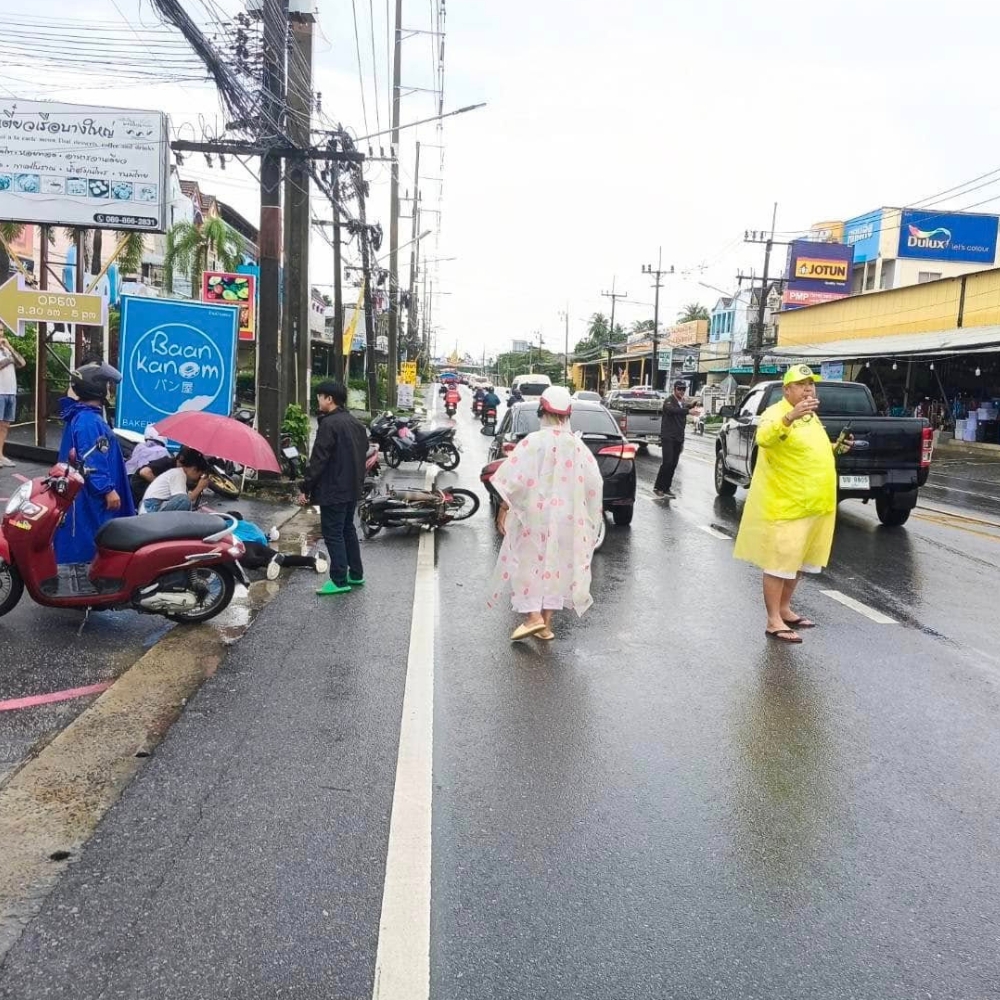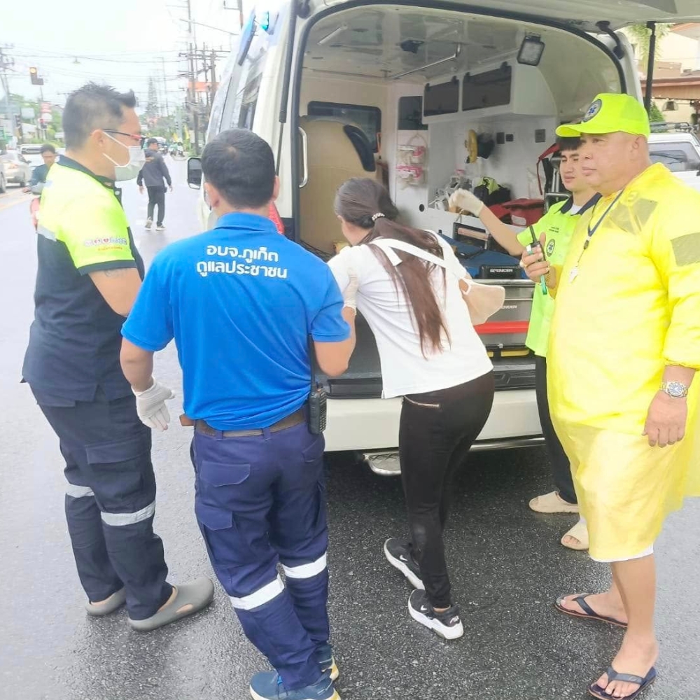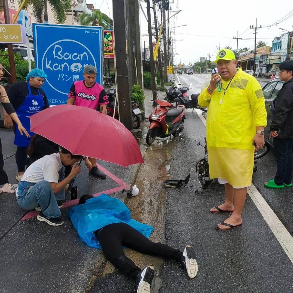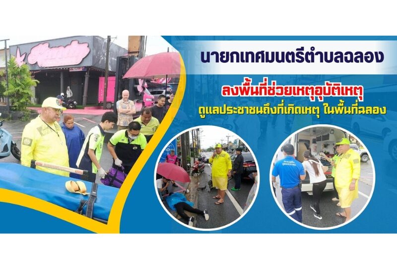 นายกสำราญ จินดาพล นายกเทศมนตรีตำบลฉลอง ลงพื้นที่ทันทีหลังได้รับแจ้งเหตุอุบัติเหตุบนถนนในพื้นที่ฉลอง
