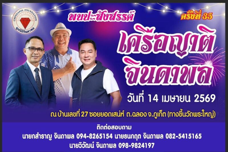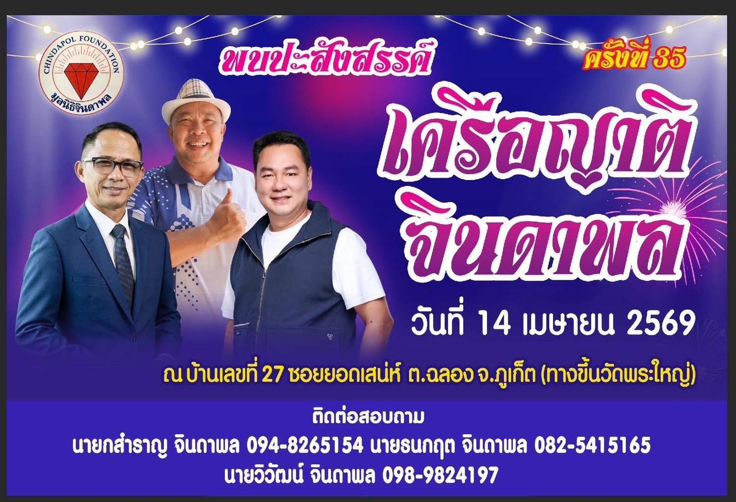 🎗มูลนิธิ “จินดาพล” ภายใต้การนำของนายสำราญ จินดาพล นายกเทศมนตรีตำบลฉลอง ขอเชิญชวนพี่น้องเครือญาติจินดาพล ร่วมงานพบปะสังสรรค์ครั้งที่ 35 ประจำปี 2569 ในวันที่ 14 เมษายนนี้ ท่ามกลางบรรยากาศแห่งความอบอุ่นและความผูกพันของคนในตระกูล ณ บ้านเลขที่ 27 ซอยยอดเสน่ห์ ต.ฉลอง อ.เมือง จ.ภูเก็ต (ทางขึ้นเขาพระใหญ่)