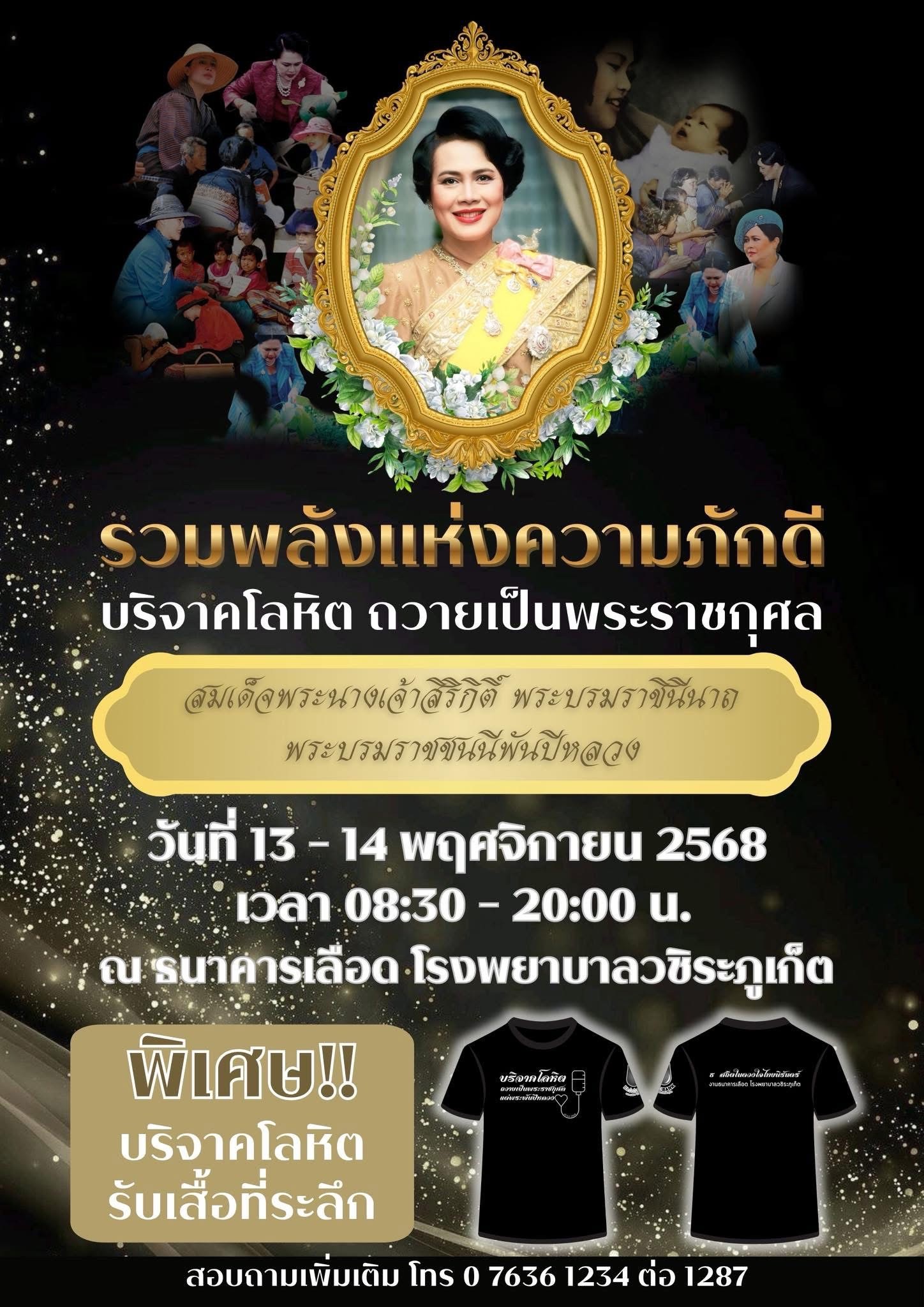 โรงพยาบาลวชิระภูเก็ต ร่วมกับเหล่ากาชาดจังหวัดภูเก็ต ขอเชิญชวนทุกท่าน ร่วมกิจกรรม “รวมพลังแห่งความภักดี” บริจาคโลหิตถวายเป็นพระราชกุศล สมเด็จพระนางเจ้าสิริกิติ์ พระบรมราชินีนาถ พระบรมราชชนนีพันปีหลวง น้อมสำนึกในพระมหากรุณาธิคุณเป็นล้นพ้นอันหาที่สุดมิได้ ร่วมส่งต่อพลังแห่งความดี ด้วยหัวใจแห่งการให้ เพื่อเทิดพระเกียรติพระผู้ทรงเป็น “แม่แห่งแผ่นดิน”