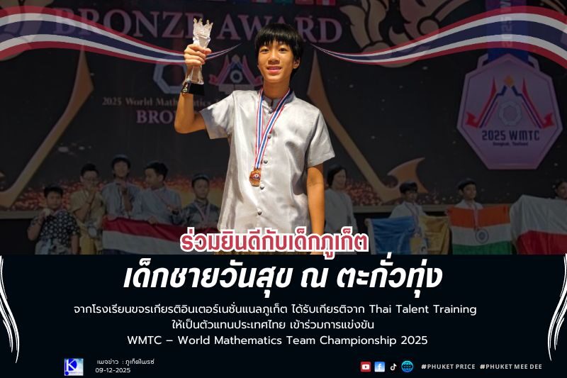เด็กชายวันสุข ณ ตะกั่วทุ่ง จากโรงเรียนขจรเกียรติอินเตอร์เนชั่นแนลภูเก็ต ได้รับเกียรติจาก Thai Talent Training ให้เป็น ตัวแทนประเทศไทย เข้าร่วมการแข่งขัน