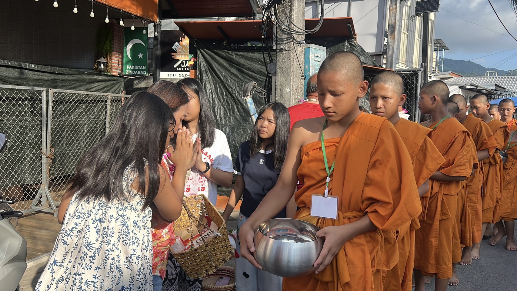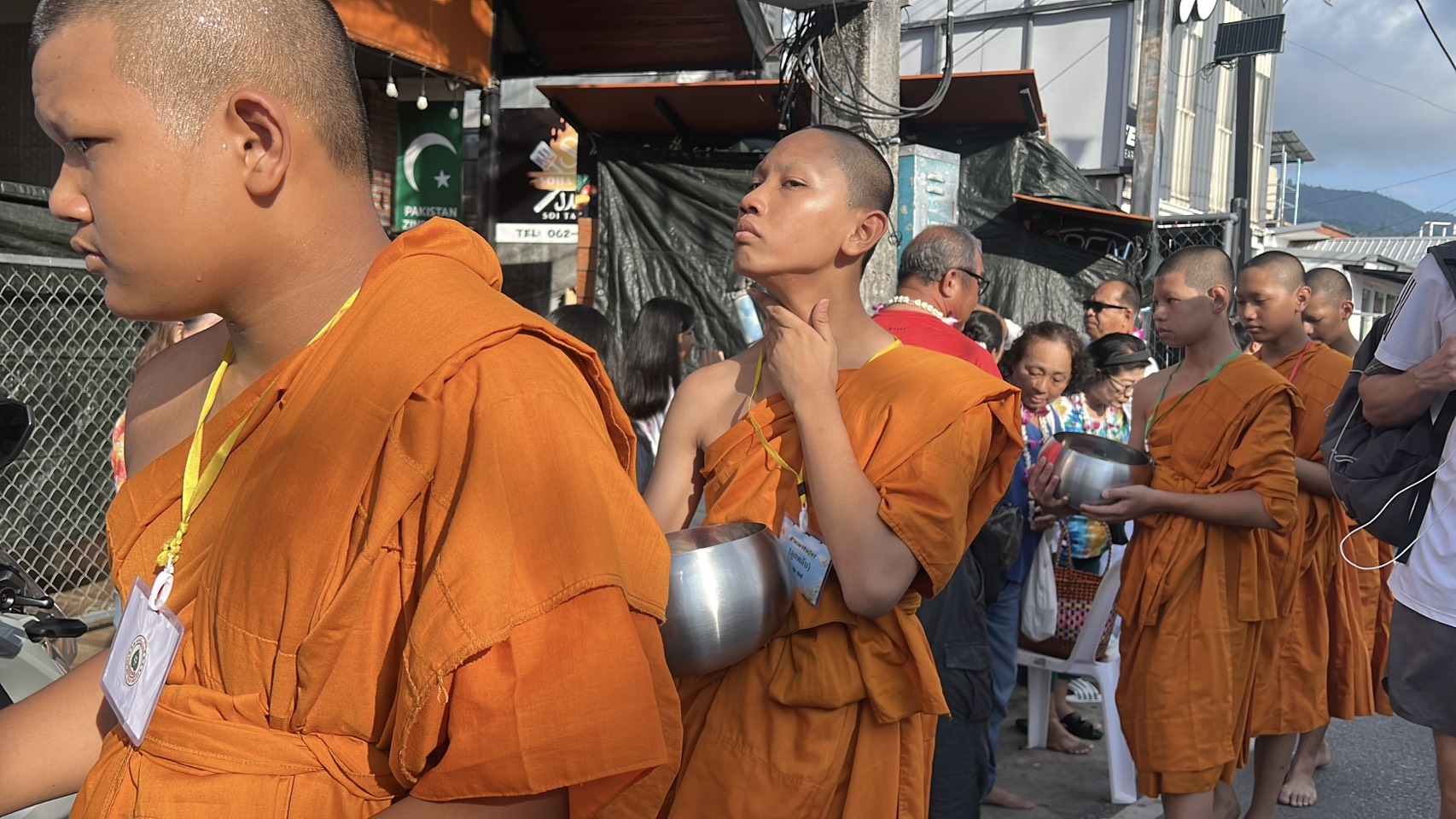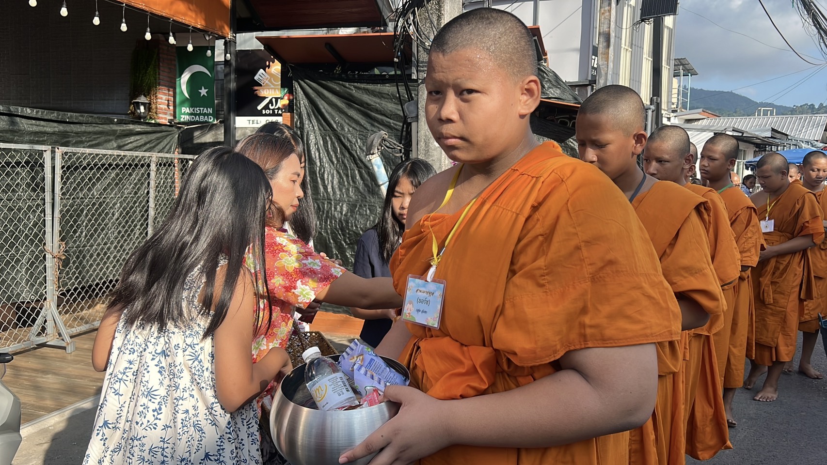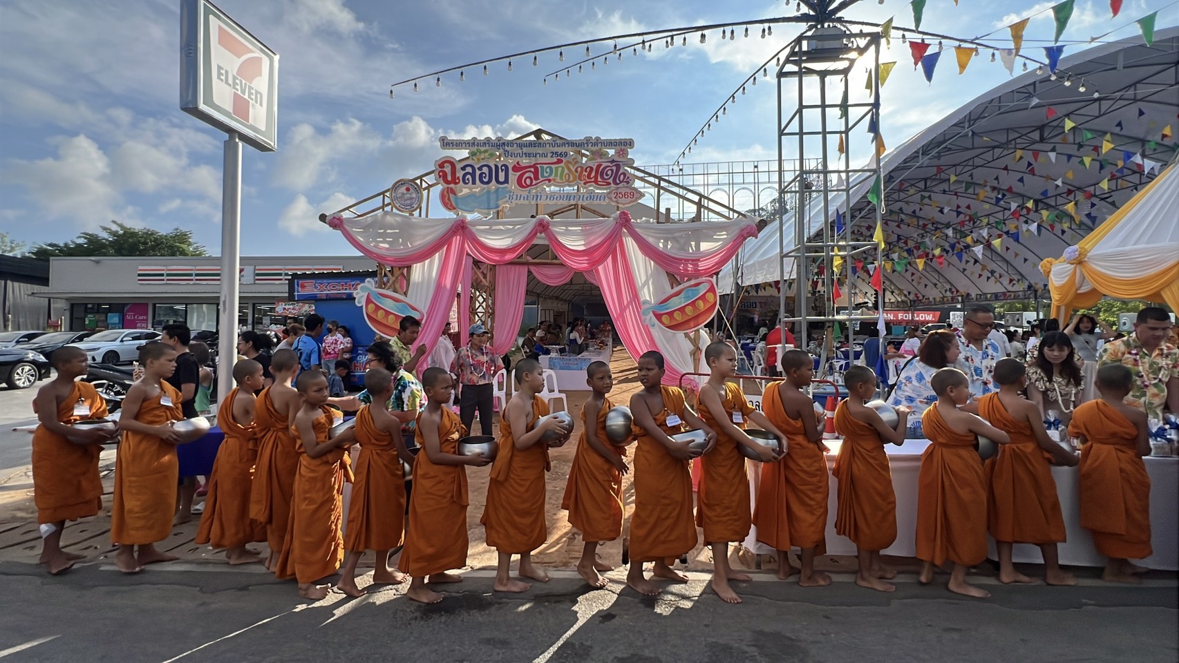 บรรยากาศช่วงเช้าเริ่มต้นด้วยพิธีตักบาตรข้าวสารอาหารแห้ง พระภิกษุสงฆ์และสามเณรกว่า 100 รูป จากวัดในพื้นที่ อาทิ วัดลัฏฐิวนาราม วัดสิริสีลวนาราม วัดไชยธาราม และวัดมงคลนิมิตรพระอารามหลวง เดินบิณฑบาตตลอดแนวซอยตาเอียด สร้างความเป็นสิริมงคลแก่ผู้ร่วมงาน