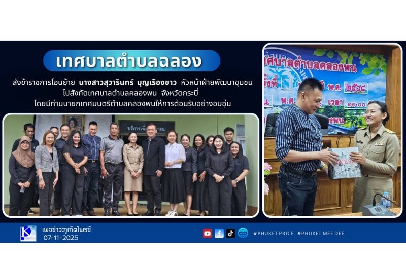 นายสำราญ จินดาพล นายกเทศมนตรีตำบลฉลอง ได้มอบหมายให้ นายชัยรัตน์ ตันทวีวงศ์ รองนายกเทศมนตรีตำบลฉลอง และนายชัยณิวัฒน์ สายสุวรรณ์ รองปลัดเทศบาล พร้อมด้วย ผู้อำนวยการกองและเจ้าหน้าที่กองสวัสดิการสังคม เป็นตัวแทน ส่ง ข้าราชการโอนย้าย นางสาวสุวารินทร์ บุญเรืองขาว หัวหน้าฝ่ายพัฒนาชุมชน ไปสังกัดเทศบาลตำบลคลองพน จังหวัดกระบี่ โดยมีท่านนายกเทศมนตรีตำบลคลองพนให้การต้อนรับอย่างอบอุ่น