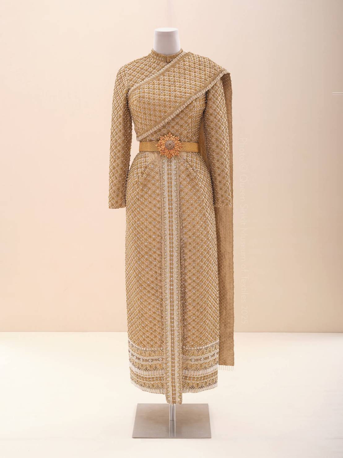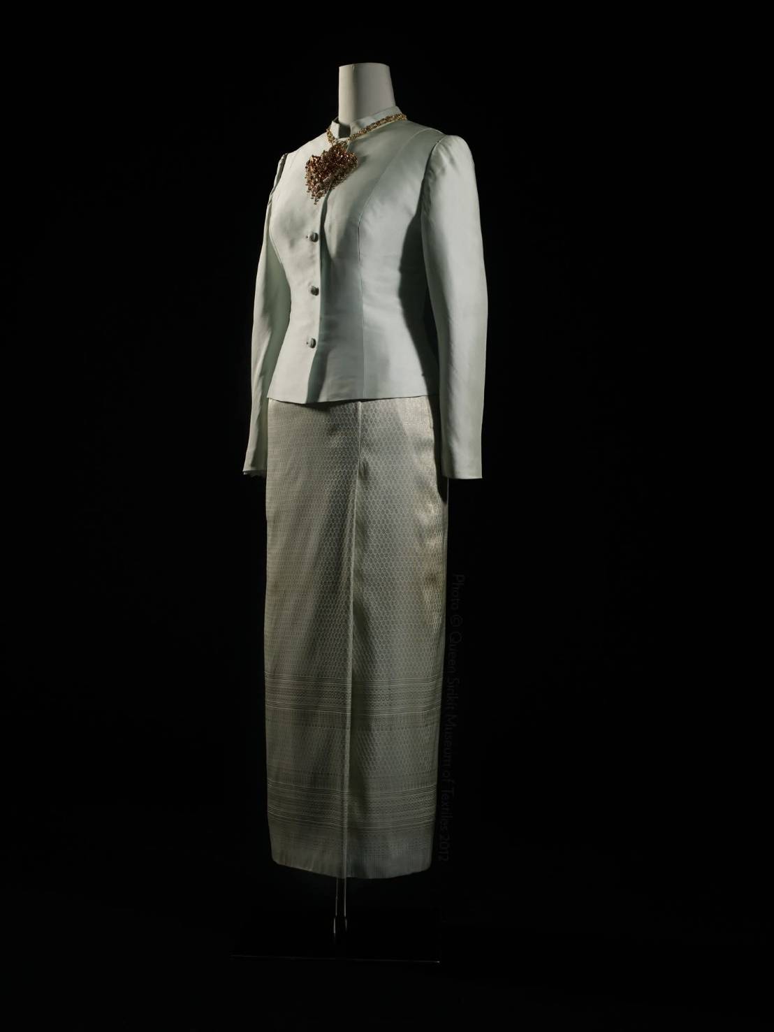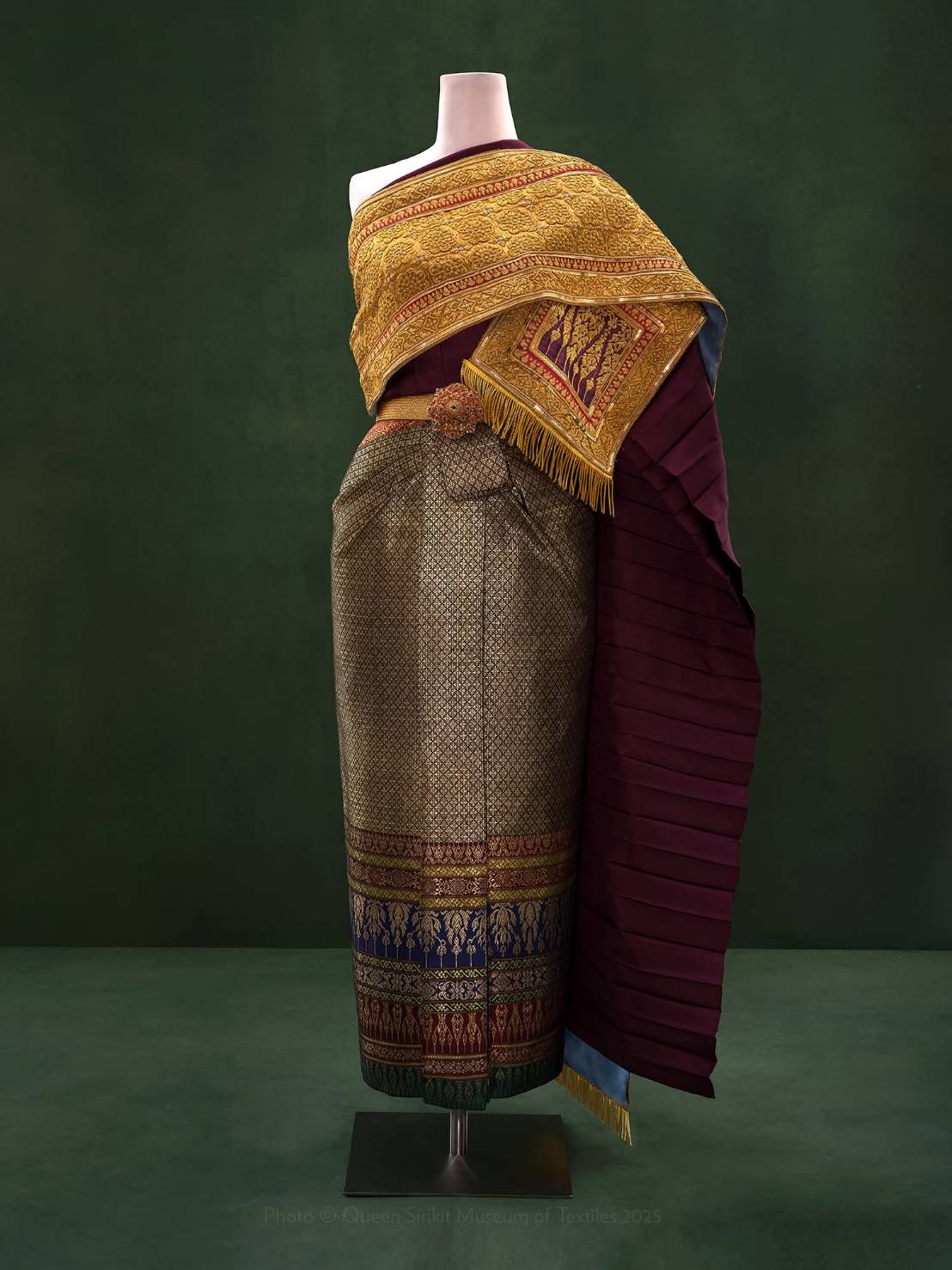 – ตัดเย็บติดกับท่อนล่าง ซึ่งเป็นผ้านุ่งจีบ ตัดเย็บจากผ้าไหมยกทอง