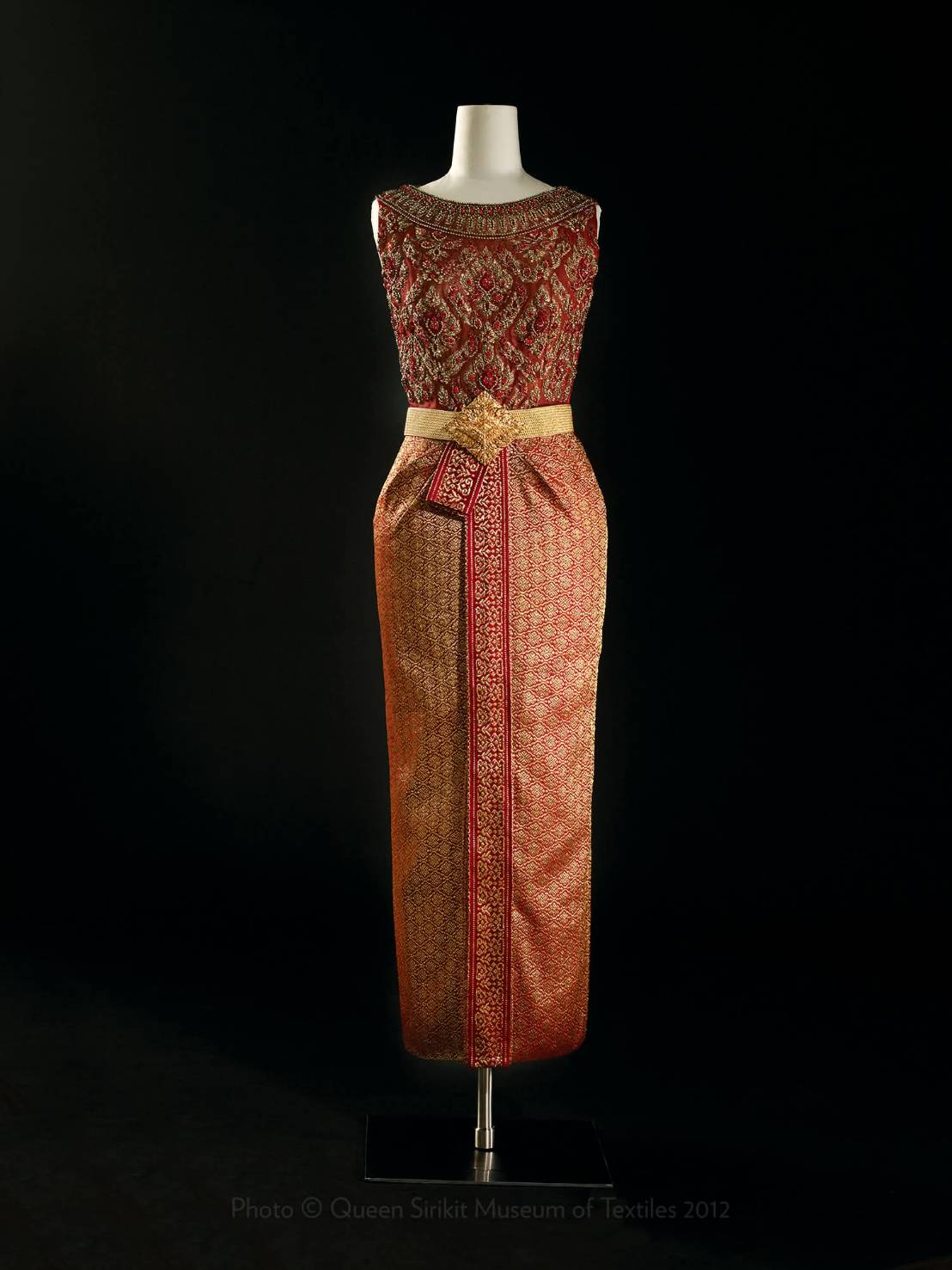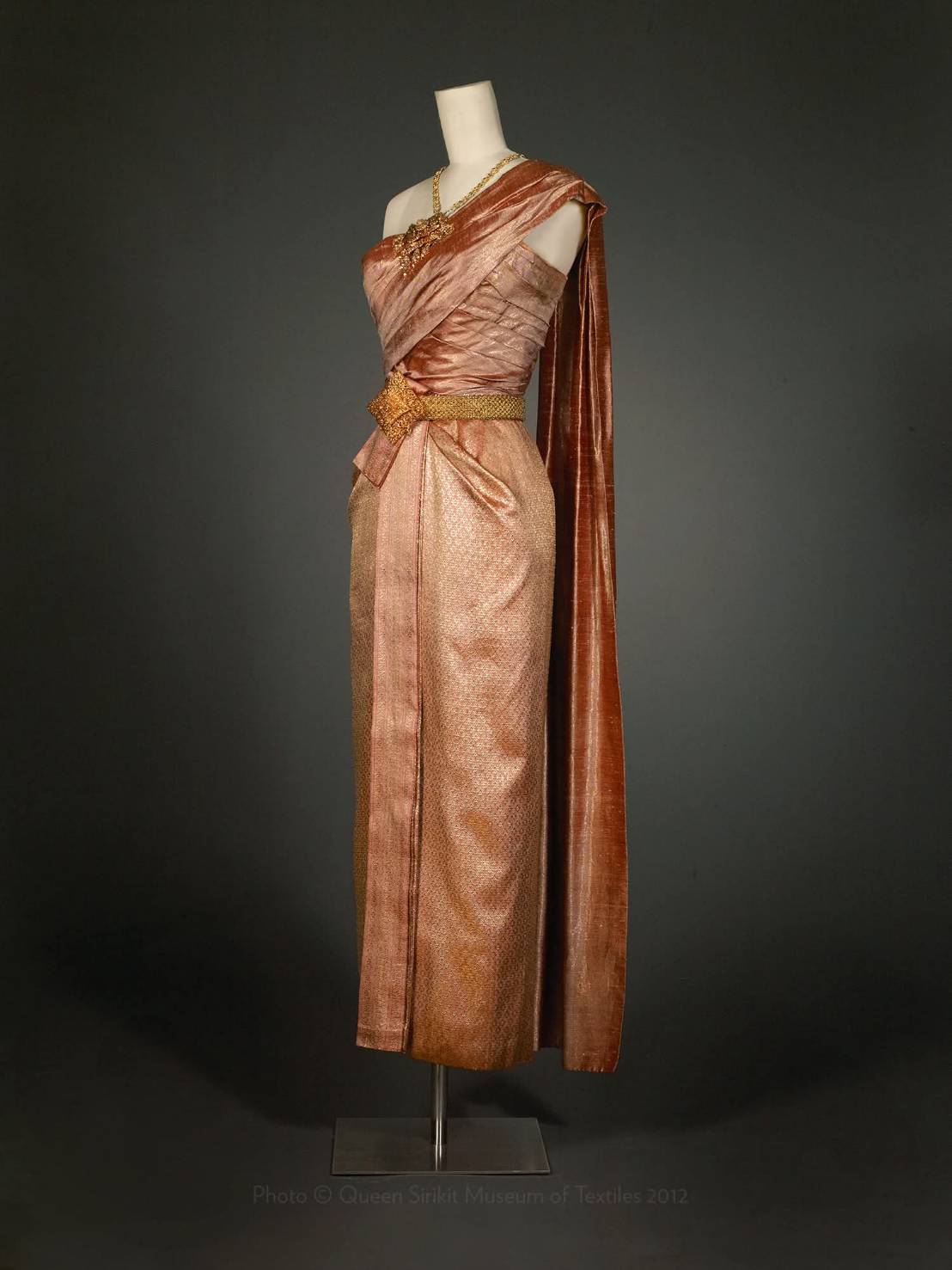 – ตัวเสื้อและผ้านุ่งติดกันเป็นชุดเดียว ใช้ซิปซ่อนกลางหลัง ยาวตั้งแต่ต้นคอจนถึงสะโพกล่าง ตัดเย็บด้วยผ้าไหมที่มีทองแกมหรือยกทองทั้งตัวก็ได้
