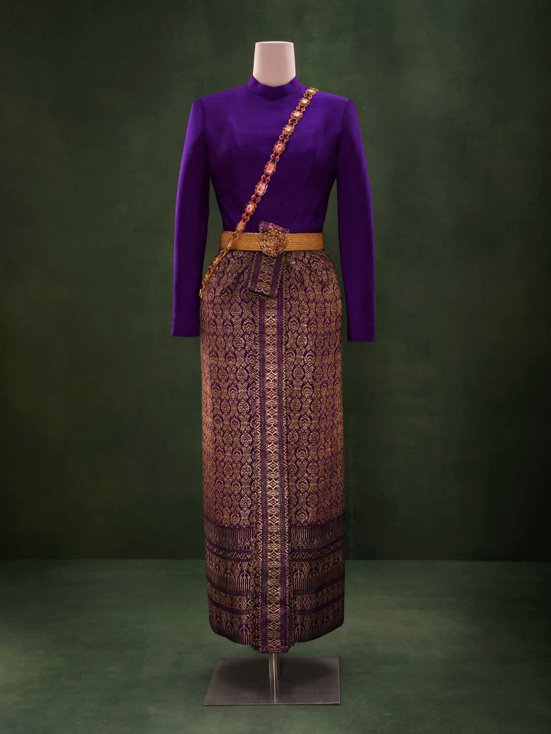 – ผ้านุ่งยกทอง จีบหน้าแบบเดียวกับชุดไทยจักรี ชายผ้านุ่งกรอมข้อเท้า ไม่ผ่าหลังหรือผ่าหน้า