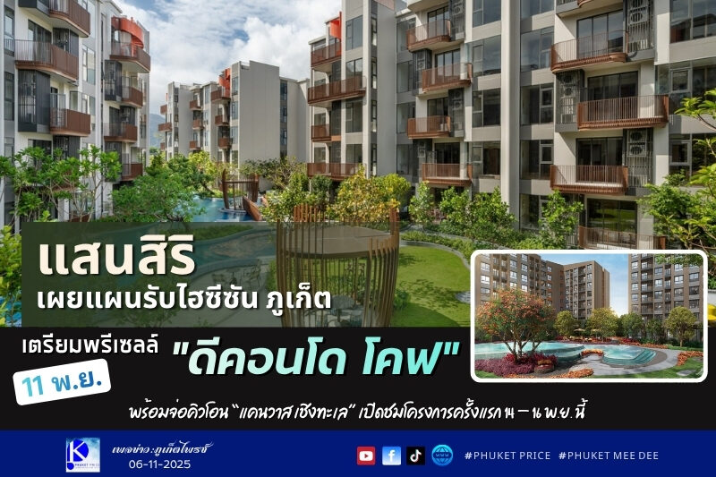 แสนสิริเผยแผนรับไฮซีซัน ภูเก็ต เตรียมพรีเซลล์ “ดีคอนโด โคฟ” 11 พ.ย. ตอกย้ำเจ้าตลาดทำเล กะทู้ พร้อมจ่อคิวโอน “แคนวาส เชิงทะเล” เปิดชมโครงการครั้งแรก 14 – 16 พ.ย. นี้