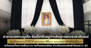 ท่าอากาศยานภูเก็ต จัดตั้งโต๊ะหมู่ประดิษฐานพระฉายาลักษณ์ สมเด็จพระนางเจ้าสิริกิติ์ พระบรมราชินีนาถ พระบรมราชชนนีพันปีหลวง พร้อมเครื่องราชสักการะ เครื่องทองน้อย ประดับตกแต่งผ้าโทนขาว–ดำ