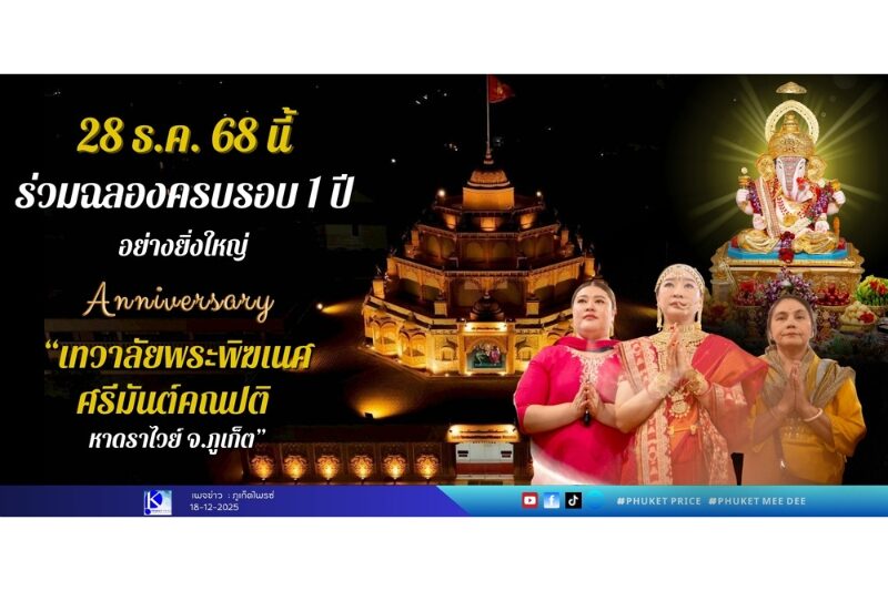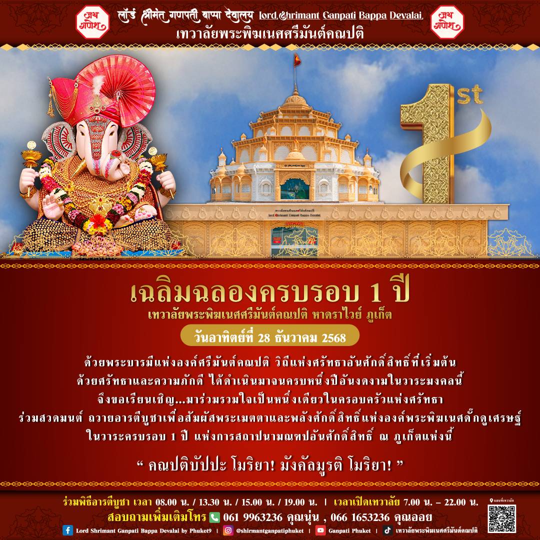 📣📣เทวาลัยพระพิฆเนศศรีมันต์คณปติ ขอเชิญทุกท่าน ร่วมงานพิธีมหามงคล เนื่องในโอกาสครบรอบ 1 ปีแห่งการก่อตั้งเทวาลัยพระพิฆเนศศรีมันต์คณปติ ในวันอาทิตย์ที่ 28 ธันวาคม พ.ศ. 2568 ณ เทวาลัยพระพิฆเนศศรีมันต์คณปติ หาดราไวย์ จังหวัดภูเก็ต โดย บริษัท ภูเก็ตไนน์ จำกัด นับว่าเป็น 1 ปีแห่งการรอคอย 1 ปีแห่งความสำเร็จและพลังศรัทธา อีกทั้งยังเป็น 1 ปีแห่งความสัมพันธ์อันดีระหว่างไทย – อินเดีย ที่เชื่อมโยงรากฐานทางวัฒนธรรม ความเชื่อ และความศรัทธาผ่านองค์พระพิฆเนศ (ปางดั๊กดูเศรษฐ์) เทพแห่งความสำเร็จและปัญญา ซึ่งเป็นที่เคารพบูชาของผู้คนทั้งสองประเทศ ตลอดระยะเวลา 1 ปีที่ผ่านมา มีผู้ศรัทธามาเยือนเทวาลัยแห่งนี้จากทั่วทุกมุมโลก กว่า 100,000 คน ไม่ว่าจะเป็นบุคคลที่มีชื่อเสียงดารานักแสดงจากทั้ง 2 ประเทศ ต่างหมุนเวียน มาสักการะไม่ขาดสาย