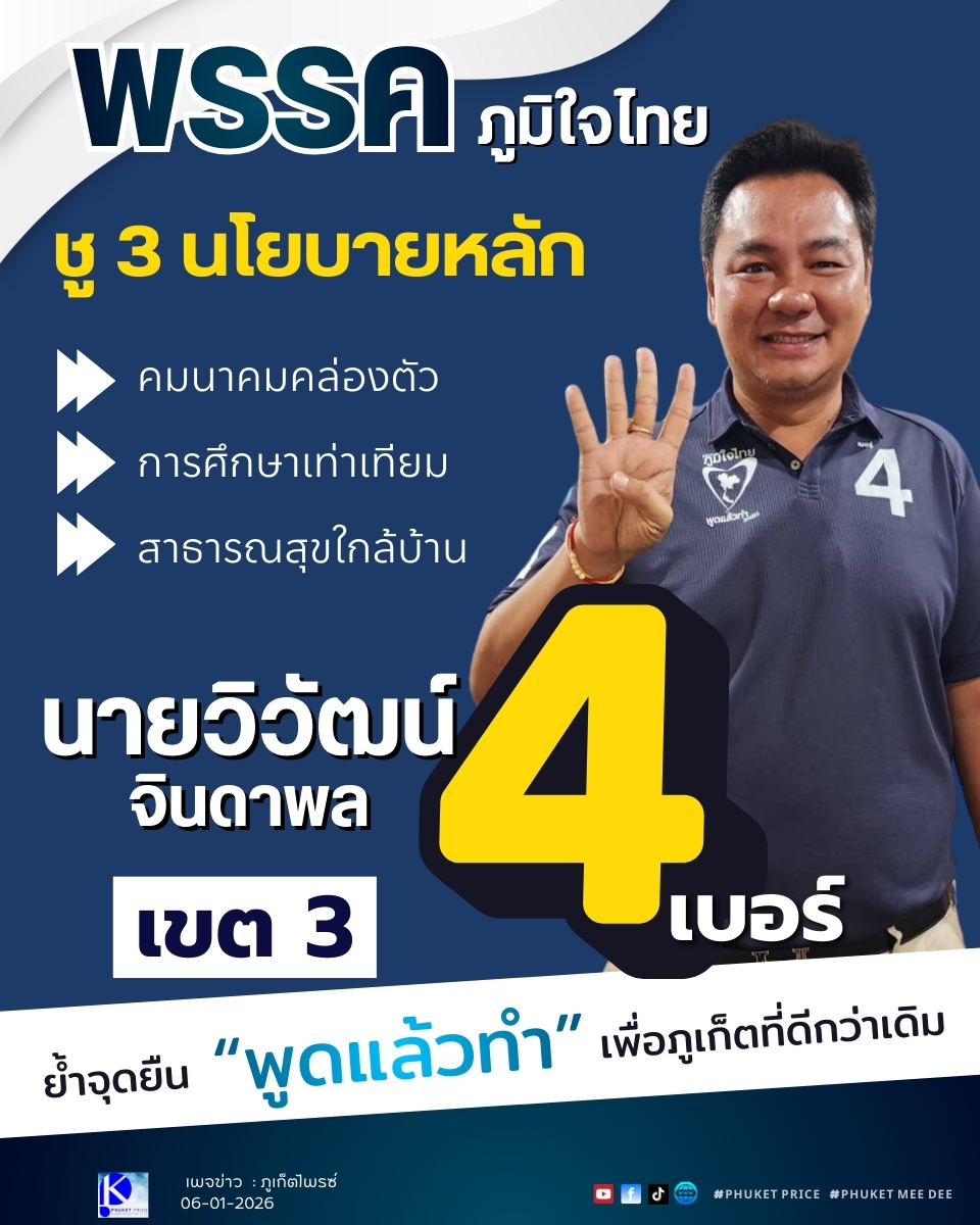 💙 ย้ำอุดมการณ์ “พูดแล้วทำ” นายวิวัฒน์ระบุว่า ทั้งคมนาคม การศึกษา และสาธารณสุข คือหัวใจสำคัญของการพัฒนาคุณภาพชีวิตประชาชน พร้อมขอแรงสนับสนุนจากพ่อแม่พี่น้องชาวภูเก็ต เพื่อร่วมกันผลักดันให้จังหวัดภูเก็ต “ดีกว่าเดิม” ตามสโลแกนของพรรคภูมิใจไทย พร้อมเชิญชวนประชาชน เลือกผู้สมัครหมายเลข 4 เขต 3 และเลือกพรรคภูมิใจไทย หมายเลข 37 ในวันเลือกตั้ง 8 กุมภาพันธ์ 2569