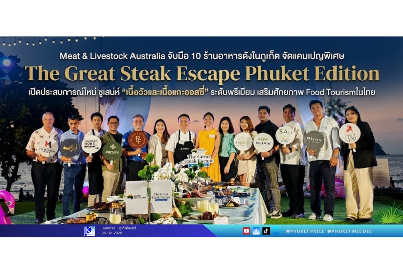 องค์กรดำเนินงานด้านการตลาด การวิจัยและพัฒนาของอุตสาหกรรมเนื้อแดงและปศุสัตว์ประเทศออสเตรเลีย (Meat and Livestock Australia: MLA) ร่วมกับ 10 ร้านอาหารชื่อดังใน จ.ภูเก็ต จัดแคมเปญพิเศษ “The Great Steak Escape Phuket Edition” ตั้งแต่ 25 กุมภาพันธ์ – 31 มีนาคม 2569 เพื่อถ่ายทอดประสบการณ์การลิ้มลองเนื้อวัวและเนื้อแกะเกรดพรีเมียมจากออสเตรเลียมารังสรรเป็นเมนูใหม่ๆ โดยเชฟมืออาชีพ สะท้อนเอกลักษณ์วัตถุดิบคุณภาพสูงที่ขึ้นชื่อด้านความนุ่ม ฉ่ำ และมีรสชาติที่กลมกล่อม พร้อมยกระดับภาพลักษณ์ประเทศไทยสู่จุดหมายปลายทางด้านอาหารระดับโลก ด้วยการเชื่อมโยงเสน่ห์วัตถุดิบเนื้อวัวและเนื้อแกะออสเตรเลียเข้ากับประสบการณ์ท่องเที่ยวเชิงอาหารใน จ.ภูเก็ต เมืองท่องเที่ยวระดับโลกที่โดดเด่นทั้งวัฒนธรรม ชายหาด บรรยากาศพักผ่อนที่งดงาม และความหลากหลายของอาหาร เพื่อสร้างมิติใหม่ให้ Food Tourism ไทยผ่านการผสานวัตถุดิบระดับโลกกับความคิดสร้างสรรค์ของเชฟชั้นนำได้อย่างลงตัว
