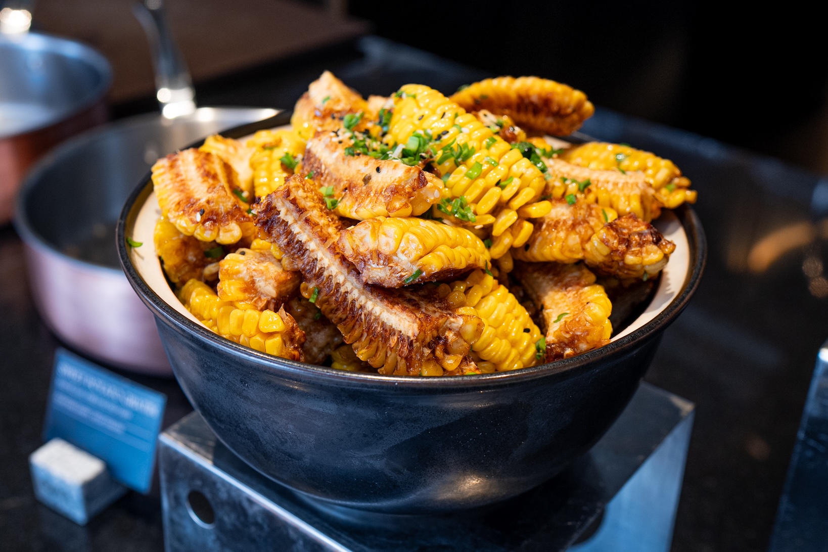 ไส้กรอกหลากสไตล์ ย่างร้อน ๆ เสิร์ฟพร้อมซอสหลายรสชาติ อีกมุมไฮไลต์คือโซนที่เปิดให้แขกมาชมการทำอาหารอย่างใกล้ชิด โดยมีเชฟซูชิมาทำมากิและนิกิริสดใหม่ และเชฟพาสต้าที่มารังสรรค์เมนูจานต่อจาน โดยให้แขกเลือกเส้นญ็อกกี สปาเก็ตตี หรือเฟตตูชินี มาคลุกเคล้ากับซอสนดูยา ซีฟู้ด หรือคาร์โบนาราเข้มข้น